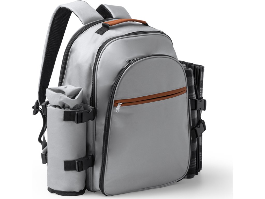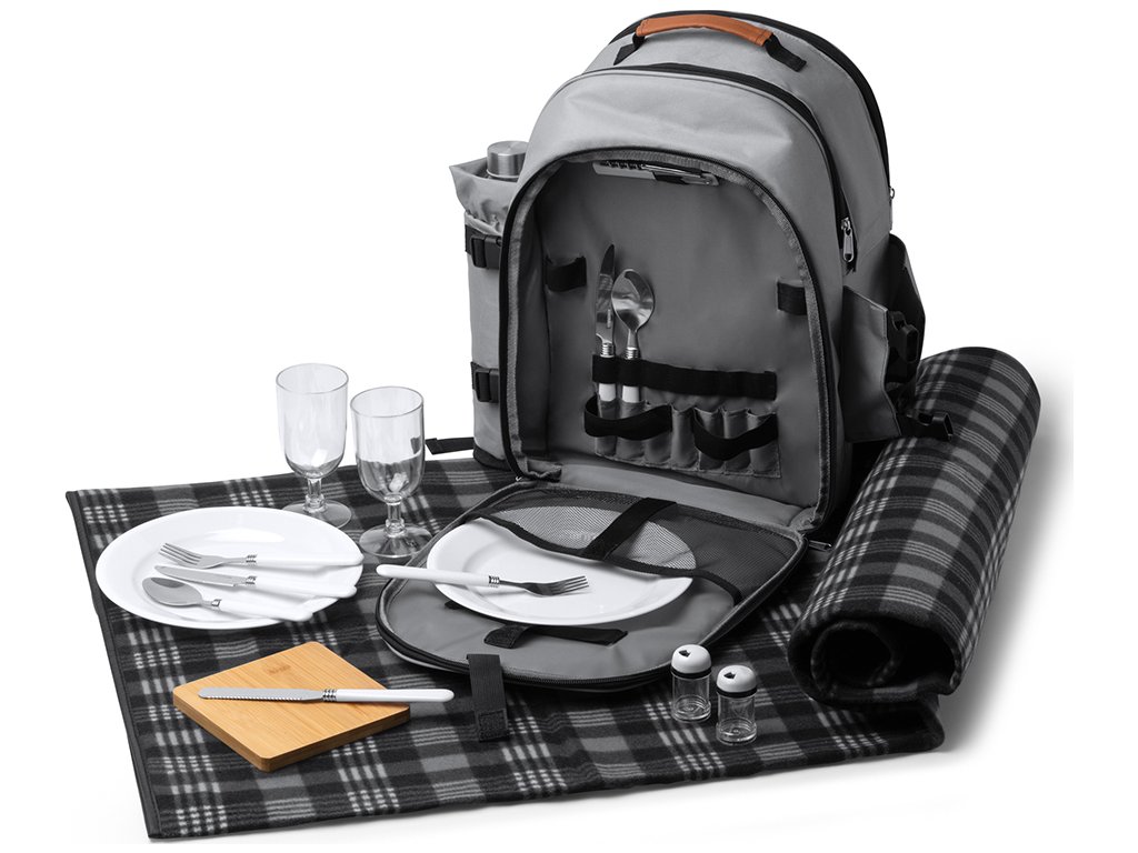 Piknikový batoh z RPET polyesteru. Hlavní přihrádka obsahuje: 2 hrnky, 2 talíře, 2 sady příborů. Jedna boční přihrádka na piknikovou deku (je součástí balení) a jedna boční přihrádka na láhev.