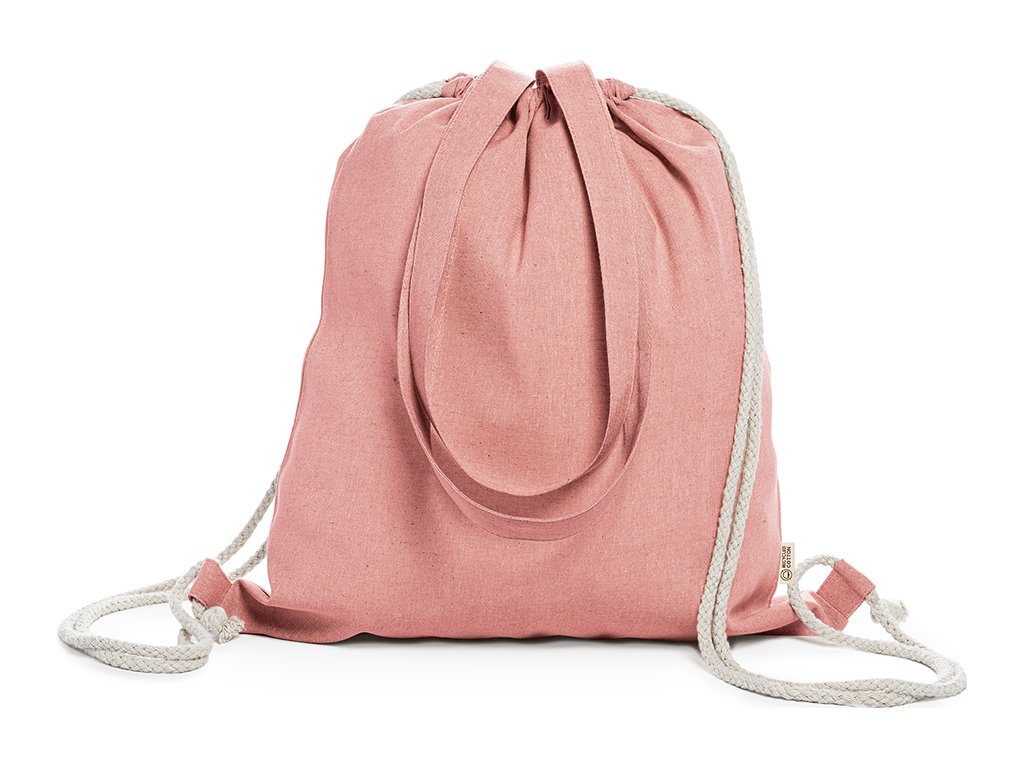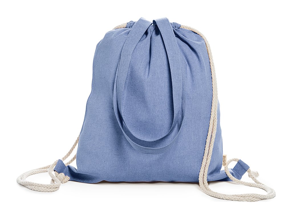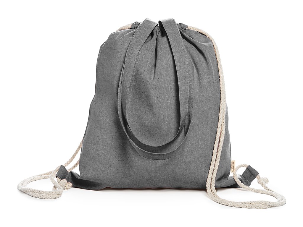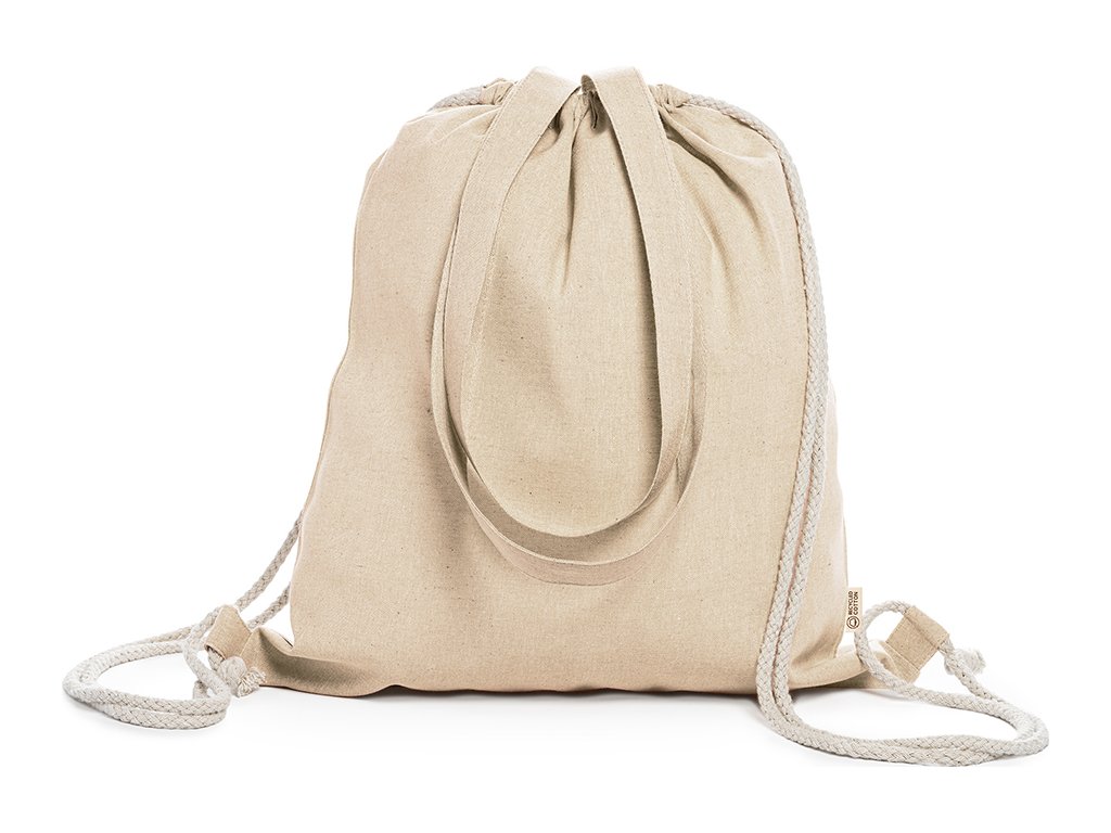 Sportovní batůžek se stahovacími šňůrkami ze 100% recyklované bavlny v kropenaté úpravě, se 70 cm dlouhými odpovídajícími uchy a šňůrkami v přírodní barvě. Gramáž 140 g/m².