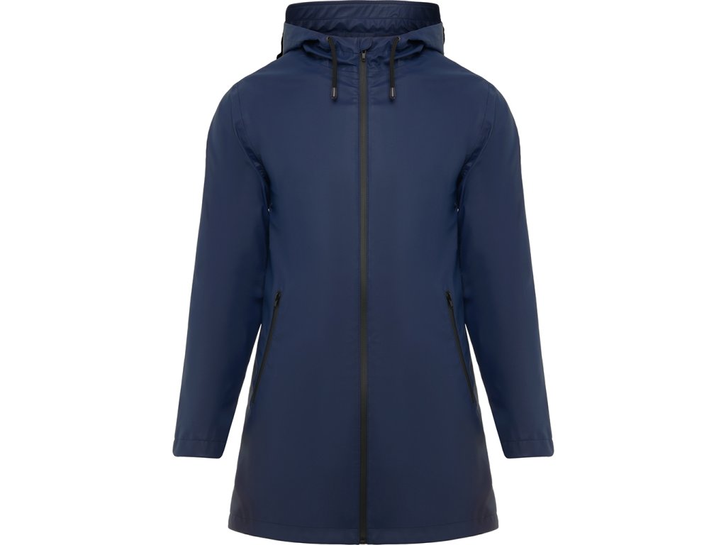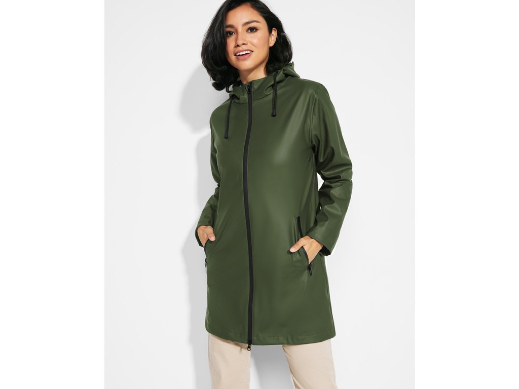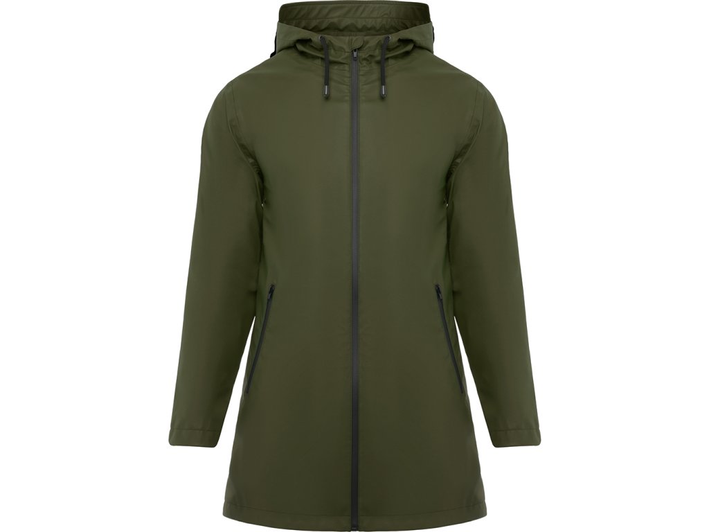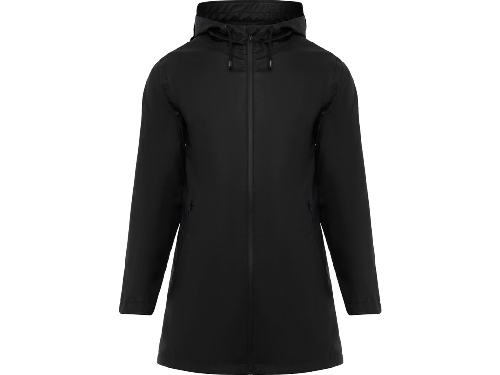 Nepromokavá bunda s kontrastními detaily v černé bervě a rozparkem na zadním lemu. Bunda má kapuci s kšiltem a dvě boční kapsy na zip. Zadní díl bundy prodloužen.