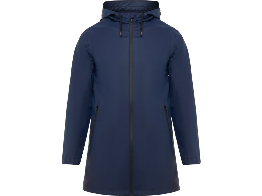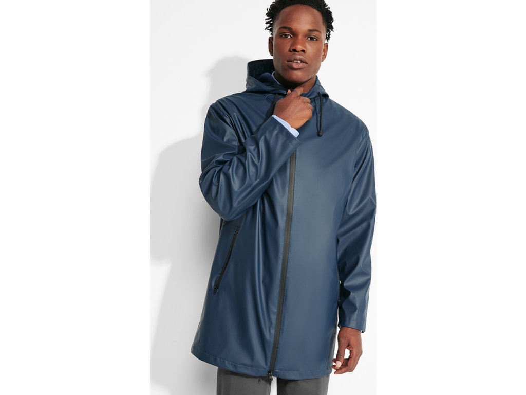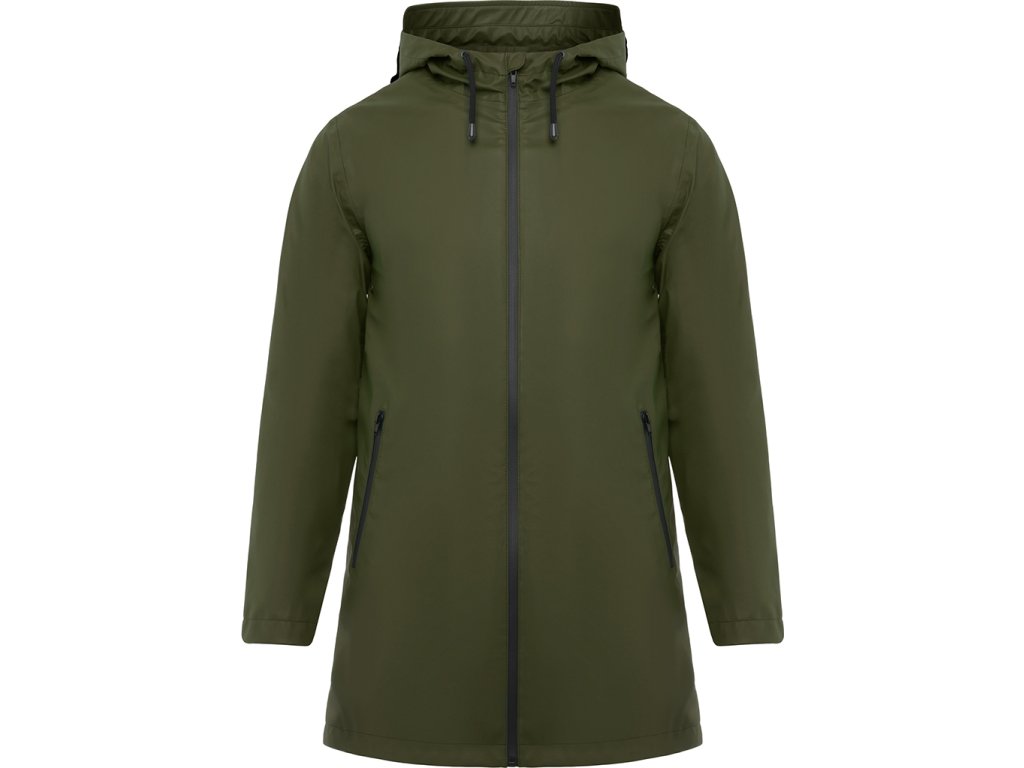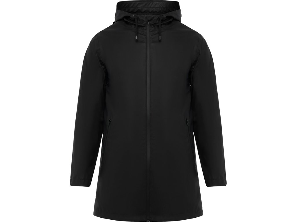 Nepromokavá bunda s kontrastními detaily v černé bervě a rozparkem na zadním lemu. Bunda má kapuci s kšiltem a dvě boční kapsy na zip.