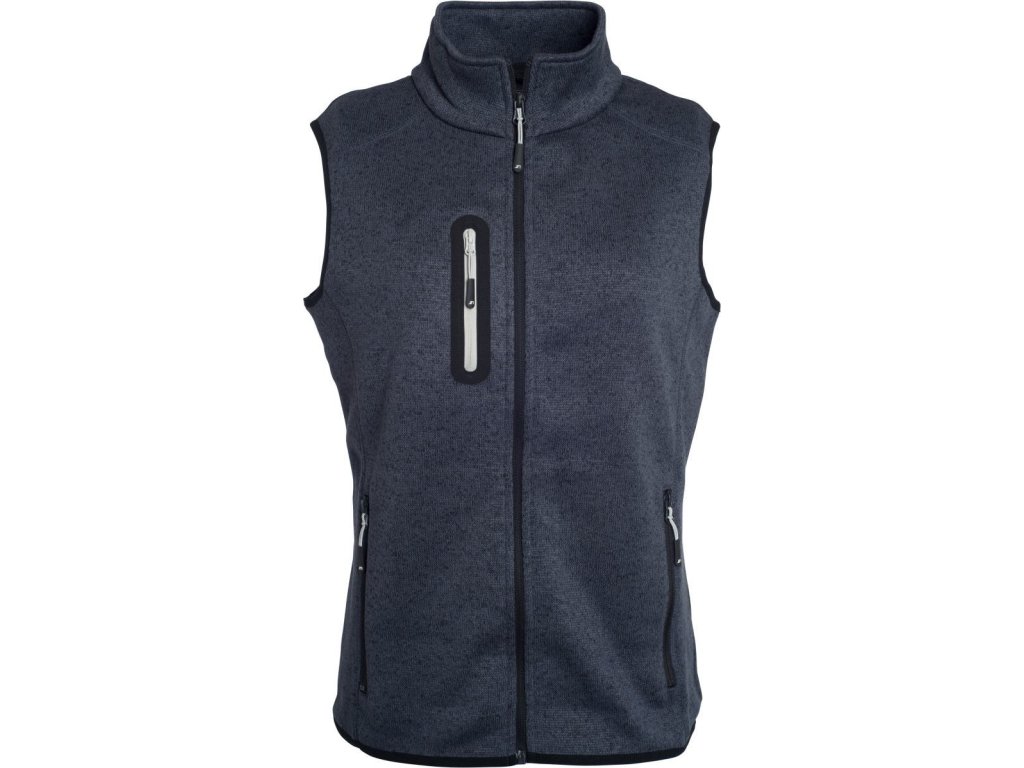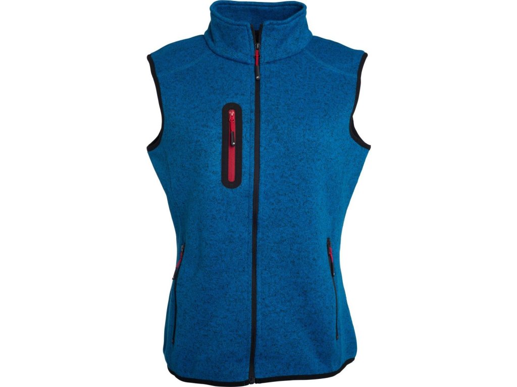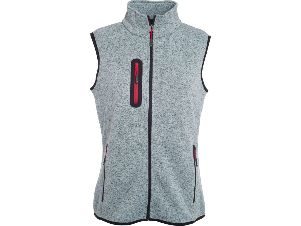 Lehce vypasovaný střih, náprsní kapsa, boční kapsy se zipem, dělící švy zdůrazňující postavu, lemování v kontrastní barvě na průramcích a lemu, pletený vzhled, uvnitř počesaná, pratelné na 30°, šetrné praní, nelze sušit v sušičce