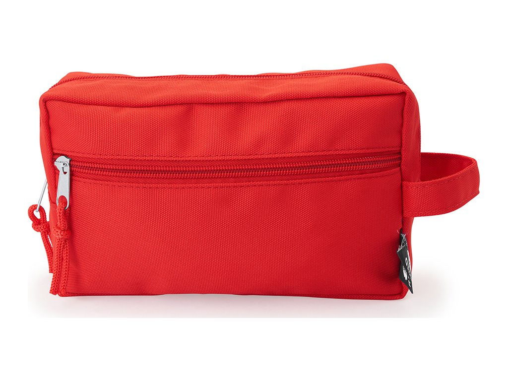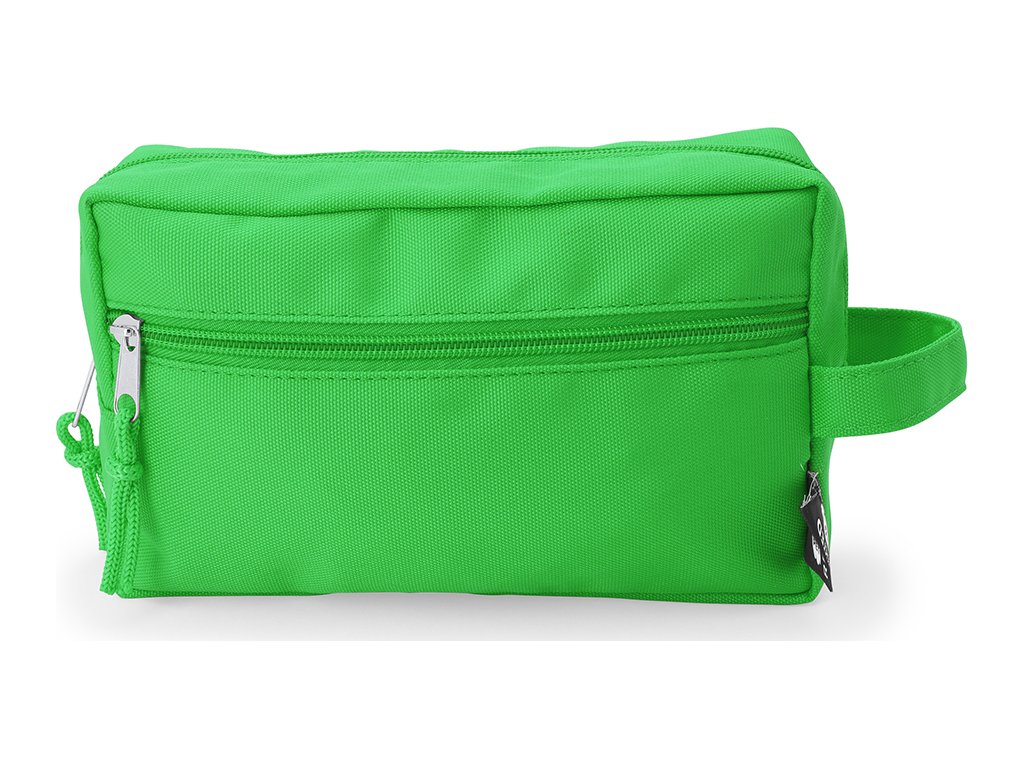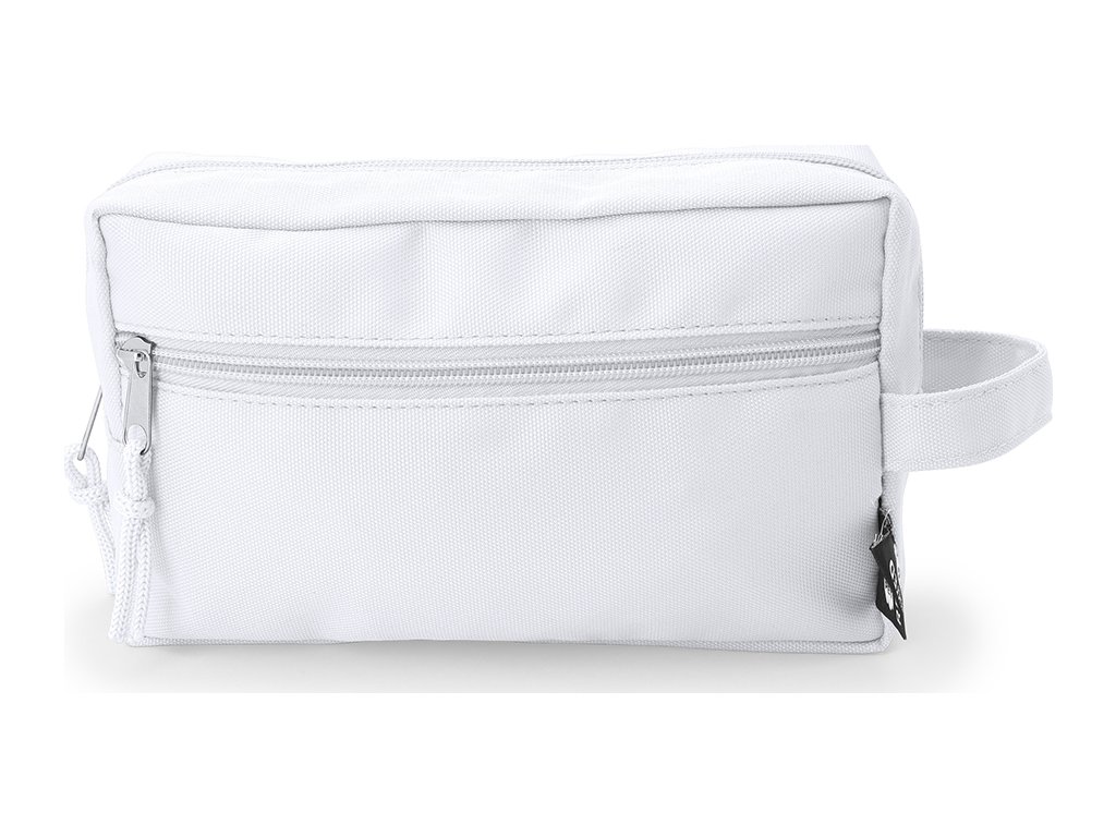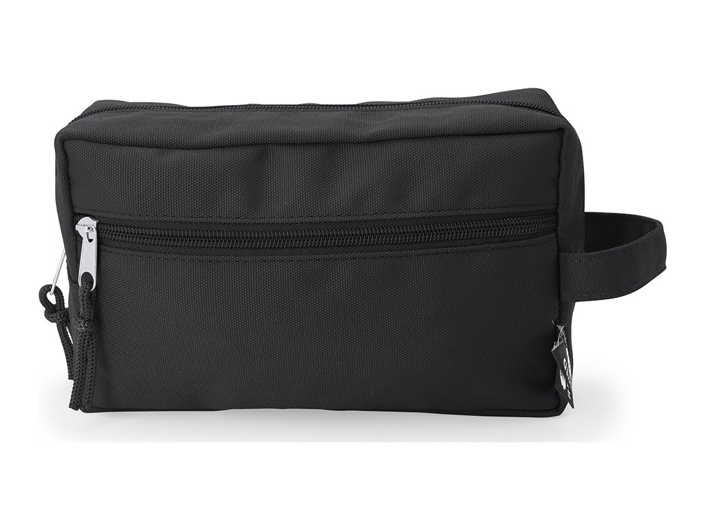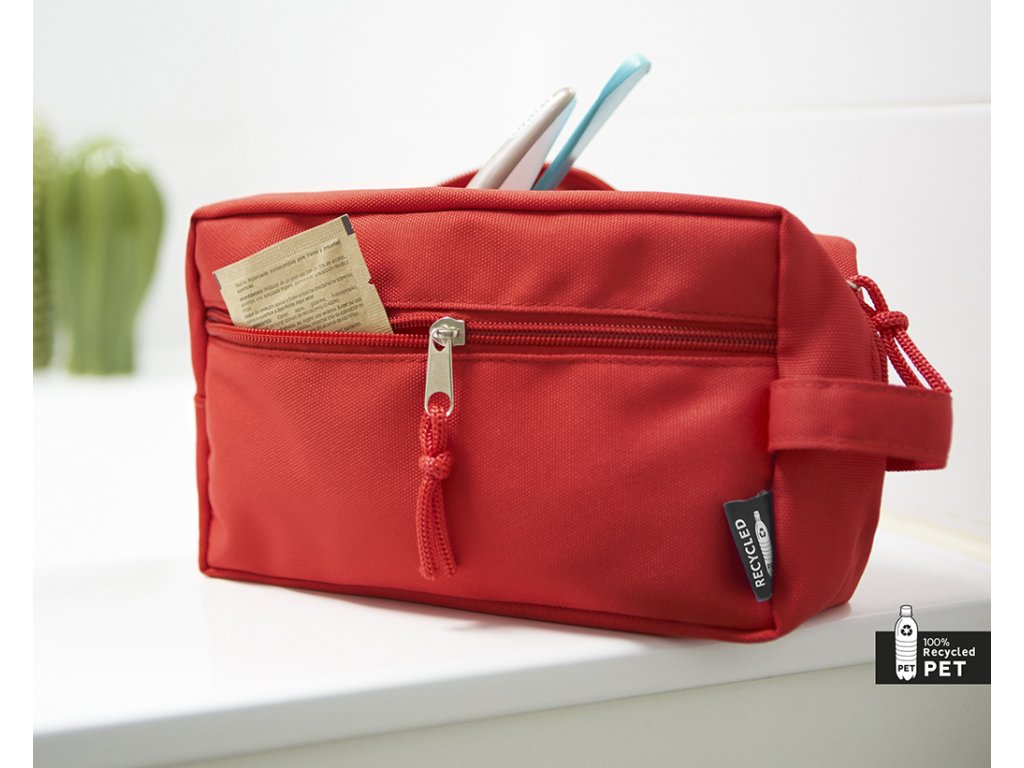 Toaletní taška se dvěma přihrádkami na zip a odpovídajícím popruhem na nošení, vyrobená z recyklovaného polyesteru 210D RPET.