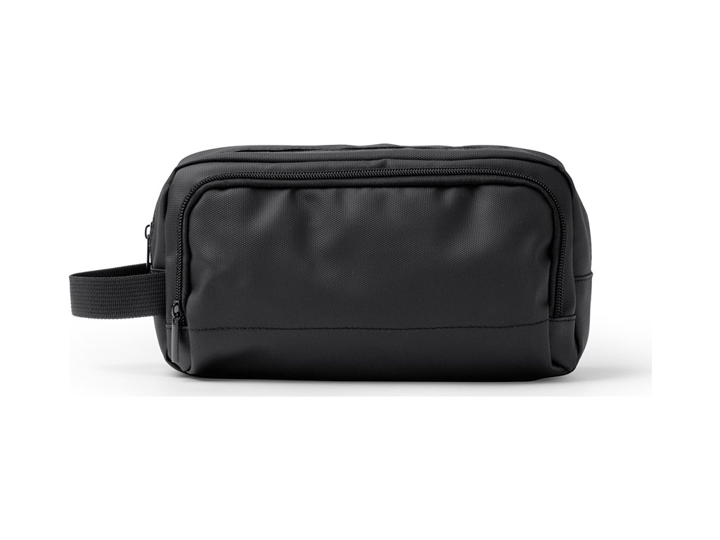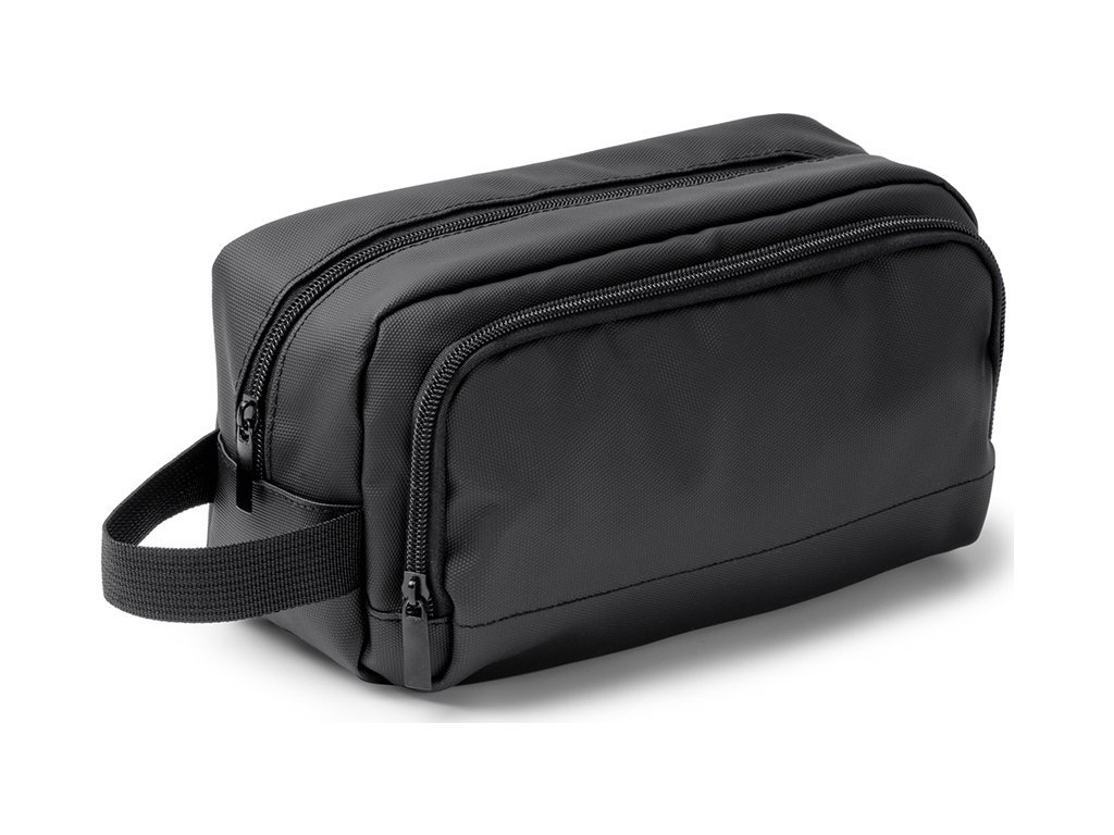Toaletní taška z PU kůže s dvojitou přihrádkou a zapínáním na zip, ideální pro bezpečné a stylové uspořádání toaletních potřeb. Součástí je držadlo na přenášení.