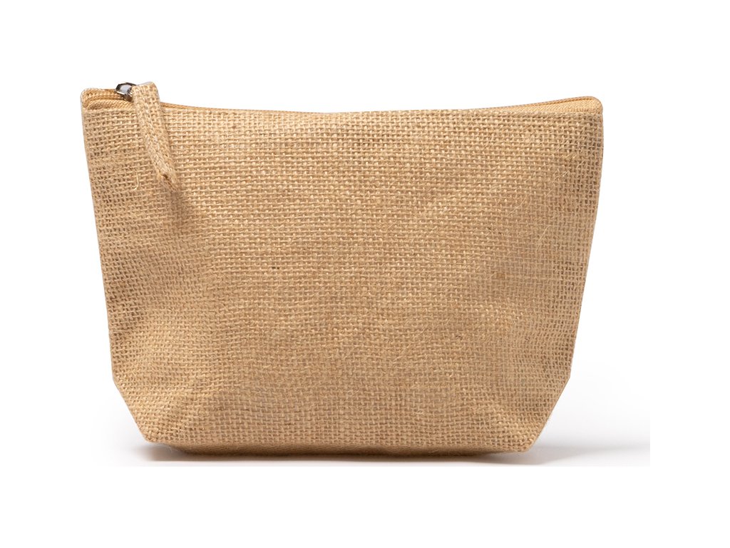 Toaletní taška z přírodní juty s odpovídajícím zipem a jutovým taháčkem.