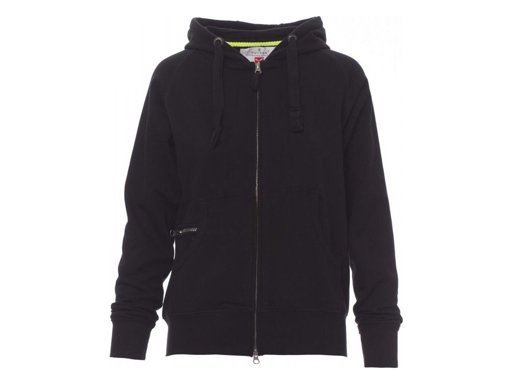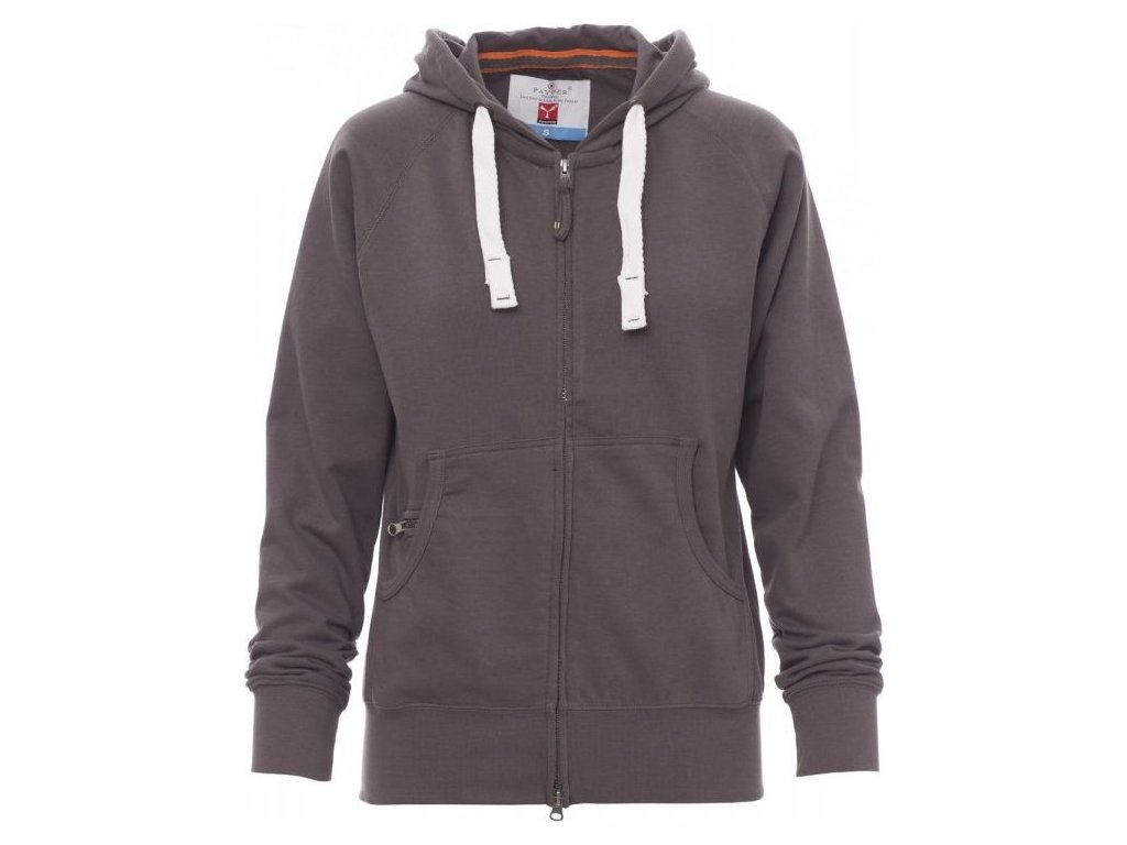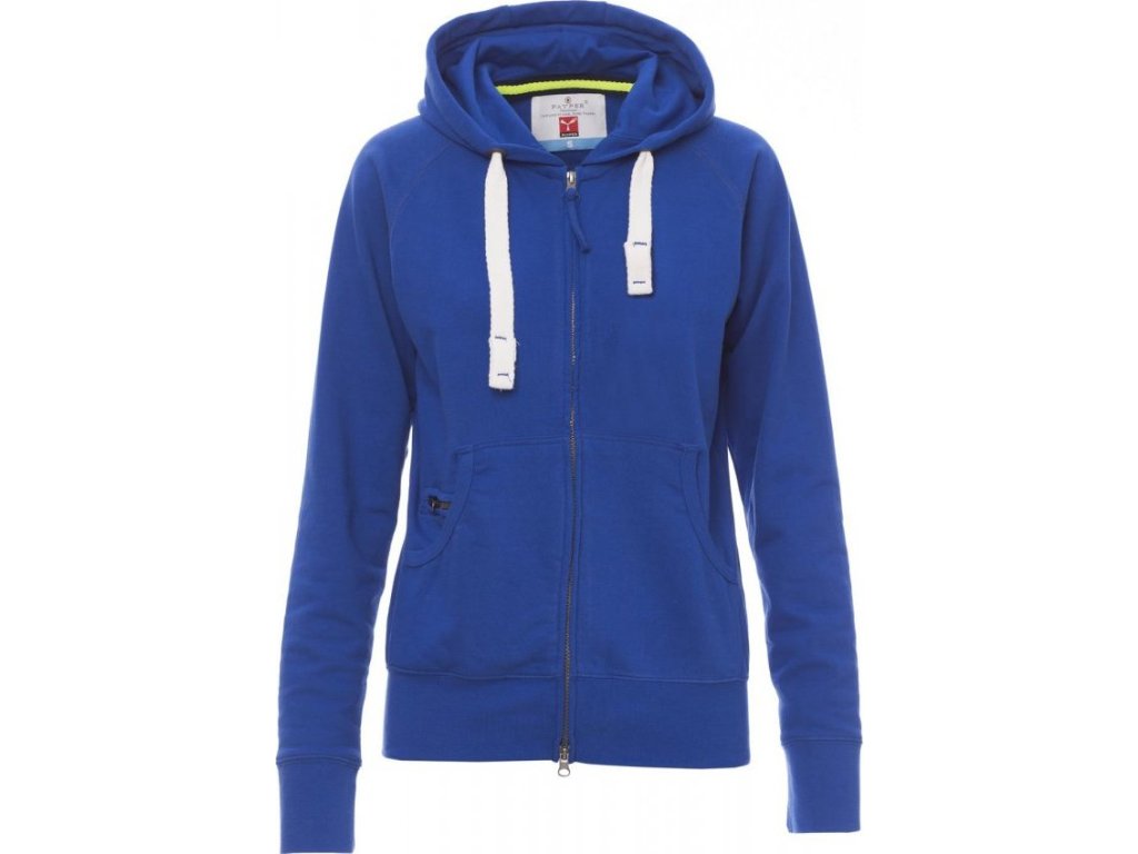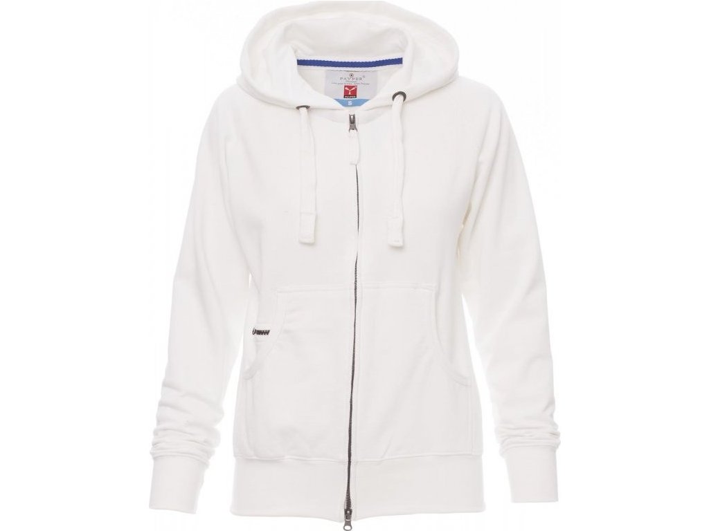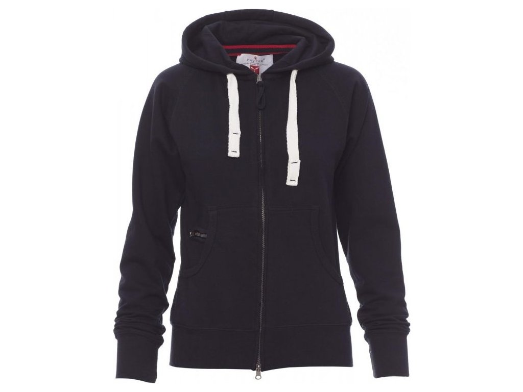 MIKINY_FULL ZIP CON CAPPUCCIO_Dámská vyštíhlená mikina s kapucí se skrytým celozipem SBS s dvojitým kovovým jezdcem, kapucí s dvojitým prošitím, bílá stahovací šňůrka se sladěným prošitím a s kovovými kroužky, raglánové rukávy, klokaní kapsa s kapsičkou na zip, manžety a pas s elastickým žebrováním, zesílené švy.