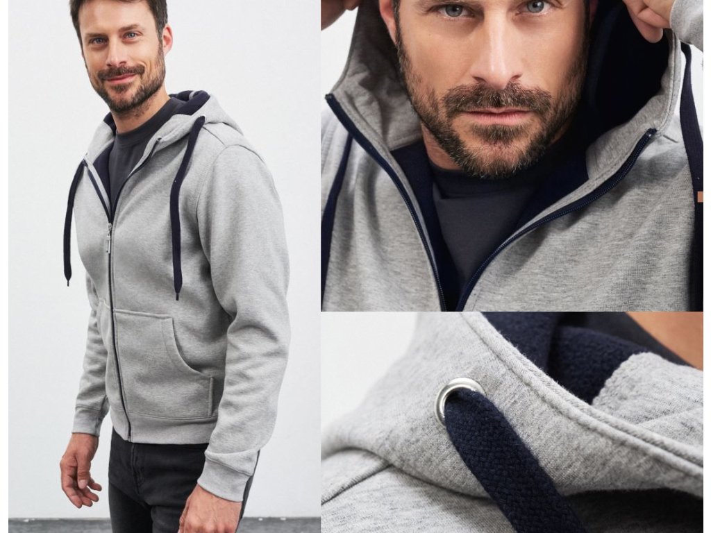 Kapuce s ochranou brady, všité rukávy, elastické manžety na rukávech a spodním lemu, klokaní kapsa, ploché švy, šňůrka, zip a vnitřní strana v kontrastní barvě, pratelné na 40°, nelze sušit v sušičce