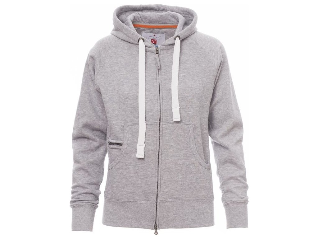 MIKINY_FULL ZIP CON CAPPUCCIO_Dámská vyštíhlená mikina s kapucí s plastovým skrytým celozipem SBS s dvojitým kovovým jezdcem, kapucí s dvojitým prošitím, bílá stahovací šňůrka se sladěným prošitím a s kovovými kroužky, raglánové rukávy, klokaní kapsa s kapsičkou na zip, manžety a pas s elastickým žebrováním, zesílené švy.