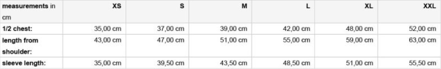 Velikostní tabulka: