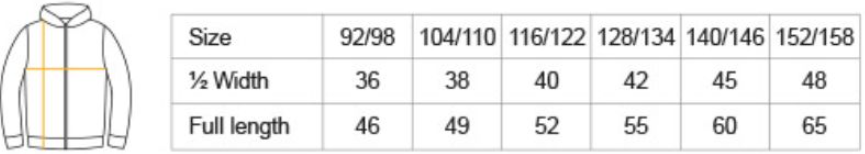 2-vrstvá kapuce bez šňůrky, žebrované manžety na rukávech a lemu, YKK zip, klokaní kapsa, uvnitř počesaná, pratelné na 60°, lze sušit v sušičce při nízké teplotě, doporučeno prát na 40°