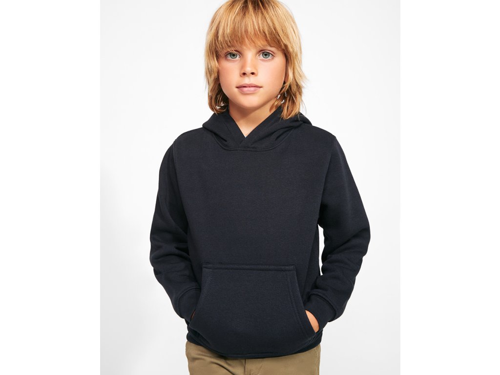 Dětská mikina s kapucí ve 2 různých provedeních- jednobarevná i 2barevná varianta. Klokaní kapsa. Vnitřní barva kapuce a šňůrky v kontrastní barvě u dvoubarevné varianty. Lemování na klokaní kapse. Manžety rukávů a spodní patent v žebrovaném úpletu 1x1.Dětské mikiny jsou z bezpečnostních důvodů dodávaný bez šňůrek.