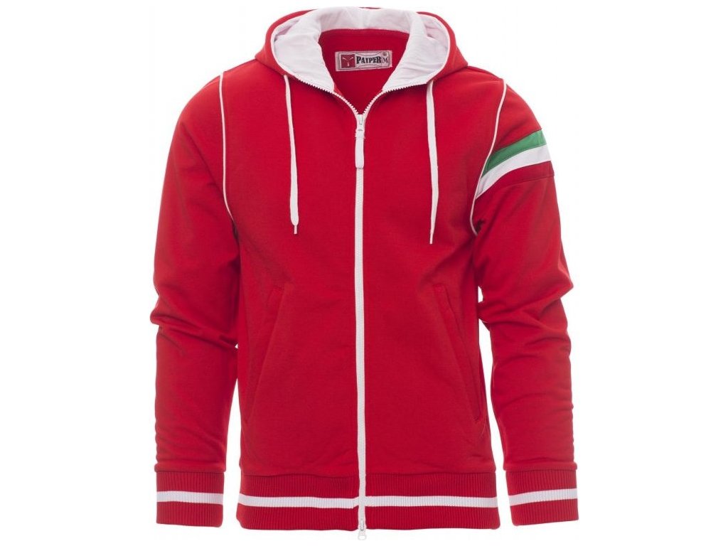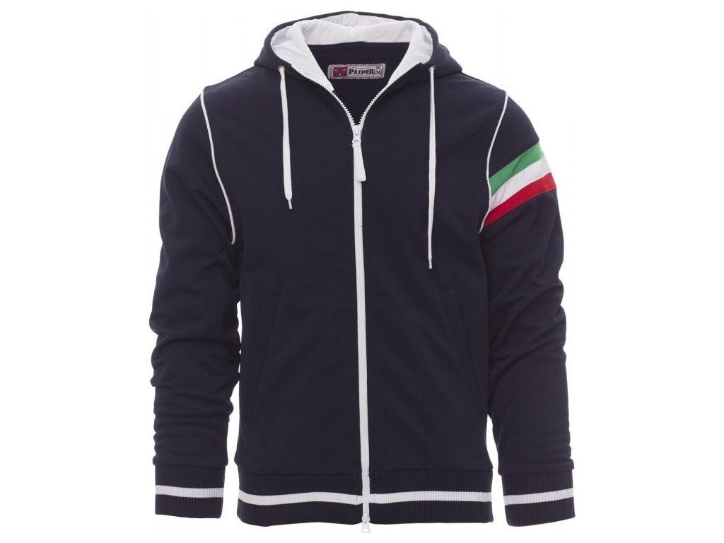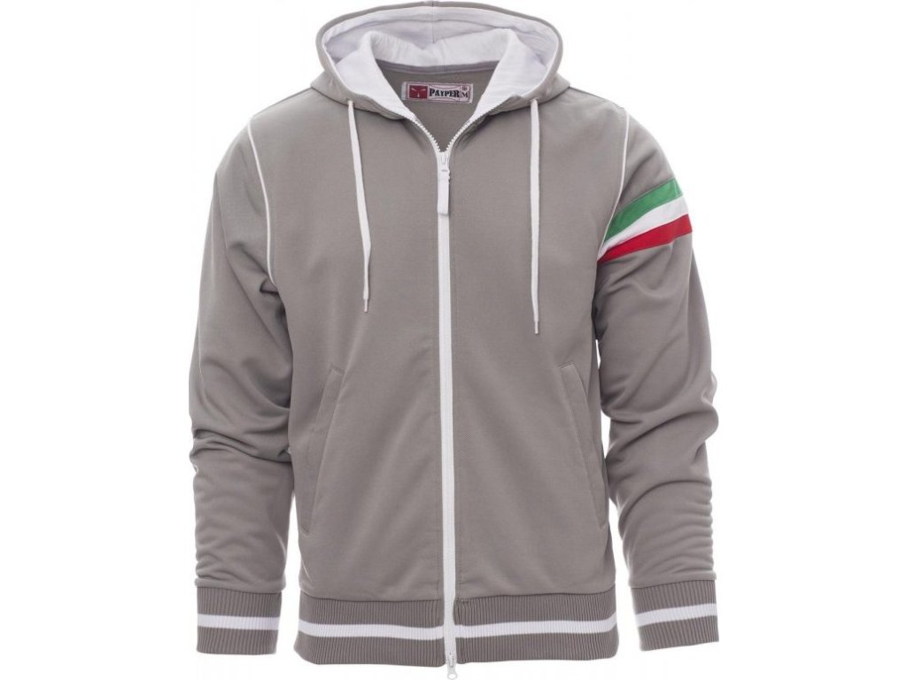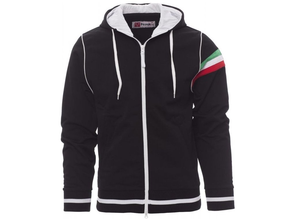 MIKINY_FULL ZIP CON CAPPUCCIO_Pánská mikina s kontrastním plastovým skrytým celozipem s dvojitým kovovým jezdcem, kapuce se stahovací šňůrkou, vnitřek kapuce a stahovací šňůrka kontrastní barvy, manžety a pas s elastickým žebrováním, kontrastní lemování průramků, levý průramek v barvách italské trikolóry, dvě kapsy na zip, zesílené švy, simil piké tkanina na vnější straně pro vyšší prodyšnost.