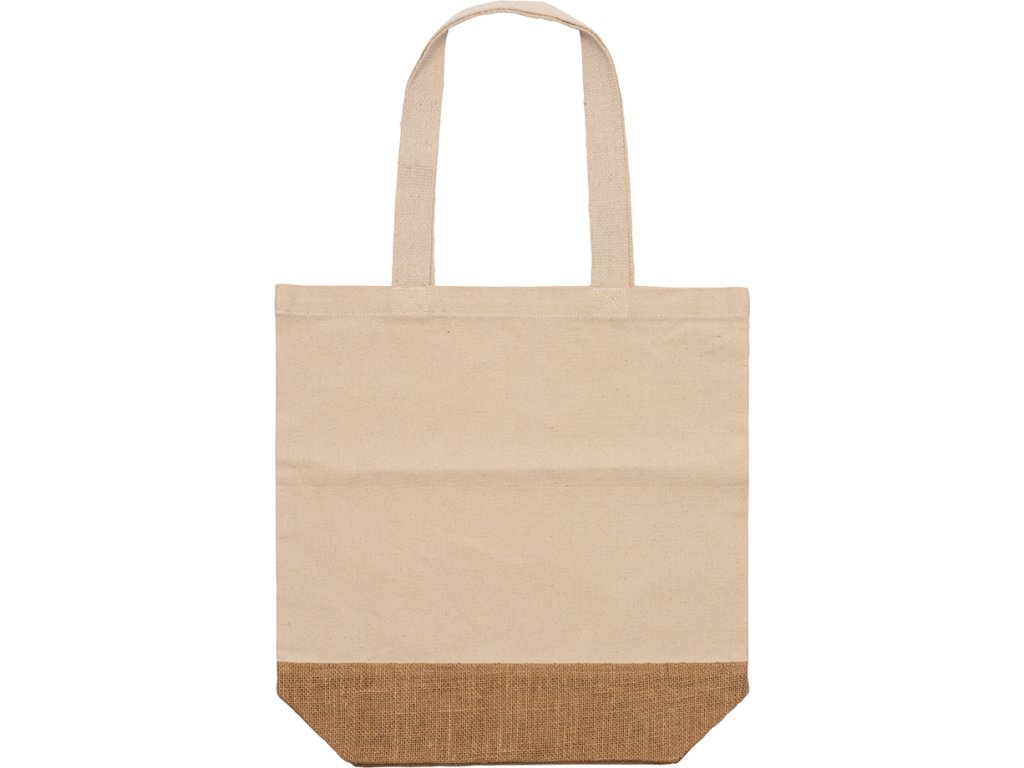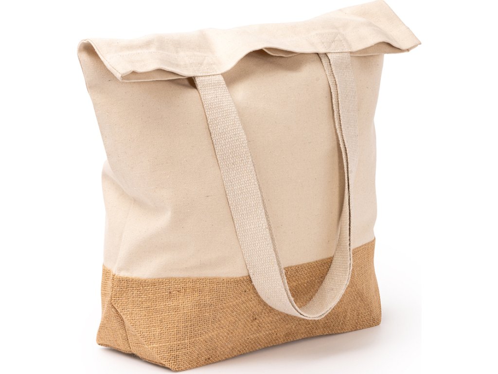 Taška z recyklované bavlny o gramáži 330 g/m² a přírodní juty. Ucha dlouhá 70 cm.