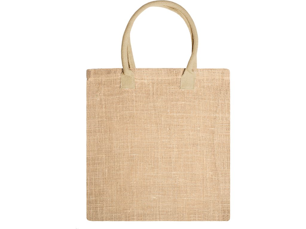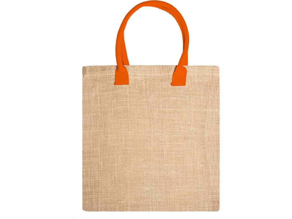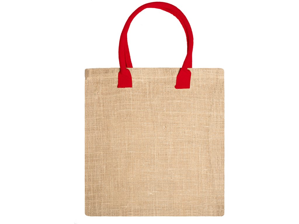 Pytel z přírodní juty se zesílenými bavlněnými uchy v barevném provedení. Sešité okraje.
