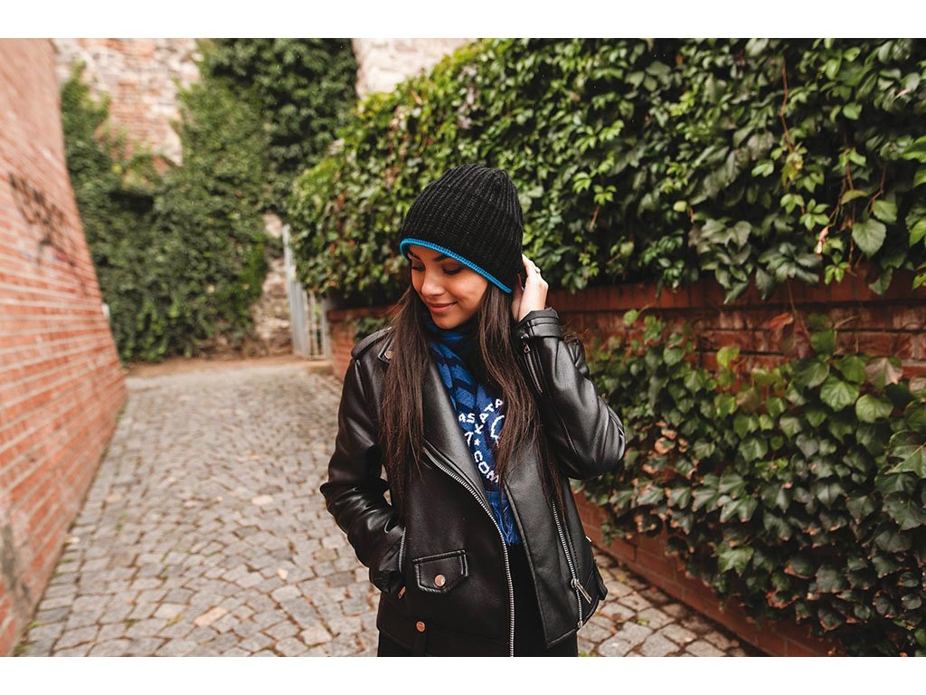 Zimní čepice s polar fleece podšívkou a kontrastním pruhem.