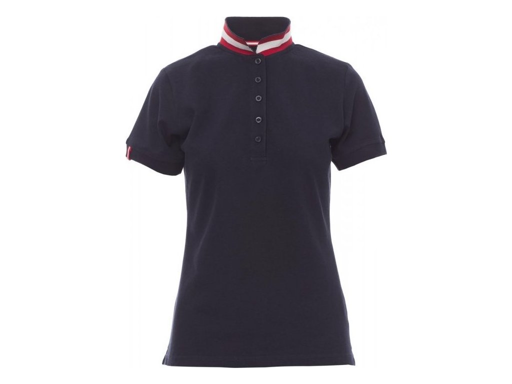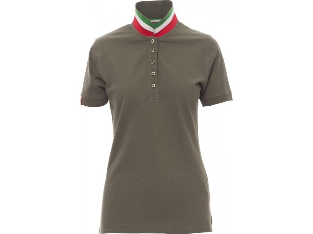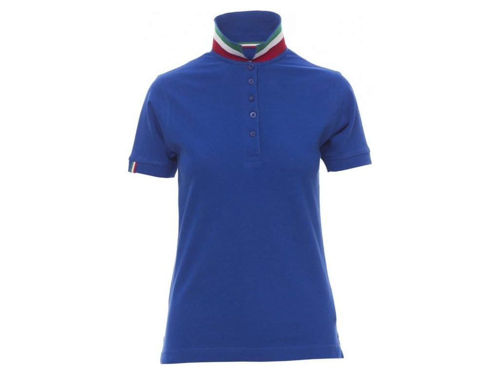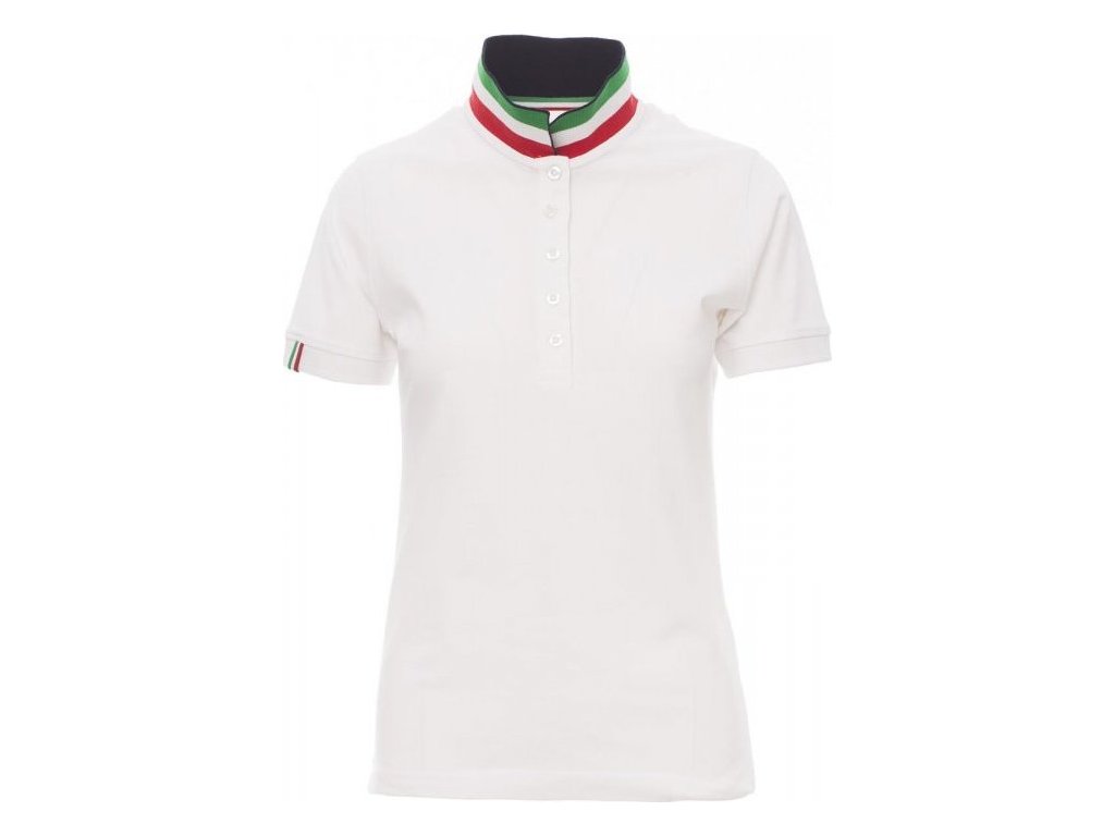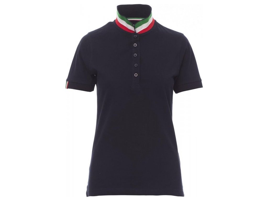 POLOKOŠILE_MANICA CORTA_Dámská vyštíhlená polokošile s krátkým rukávem s 5 barevně sladěnými perleťovými knoflíky, barevně sladěný límeček s kontrastním rubem v barvách italské vlajky, který je vidět pouze při zvednutí, barevně lemovaný pravý rukáv ve stejné barvě jako límeček, žebrovaný límeček a lemy rukávů, postranní rozparky v barvách italské vlajky, skryté prošití límečku s žerzejovým úpletem rovněž v barvách vlajky, postranní vyztužovací páska, tvarovaná výztuž na spodní straně límečku.