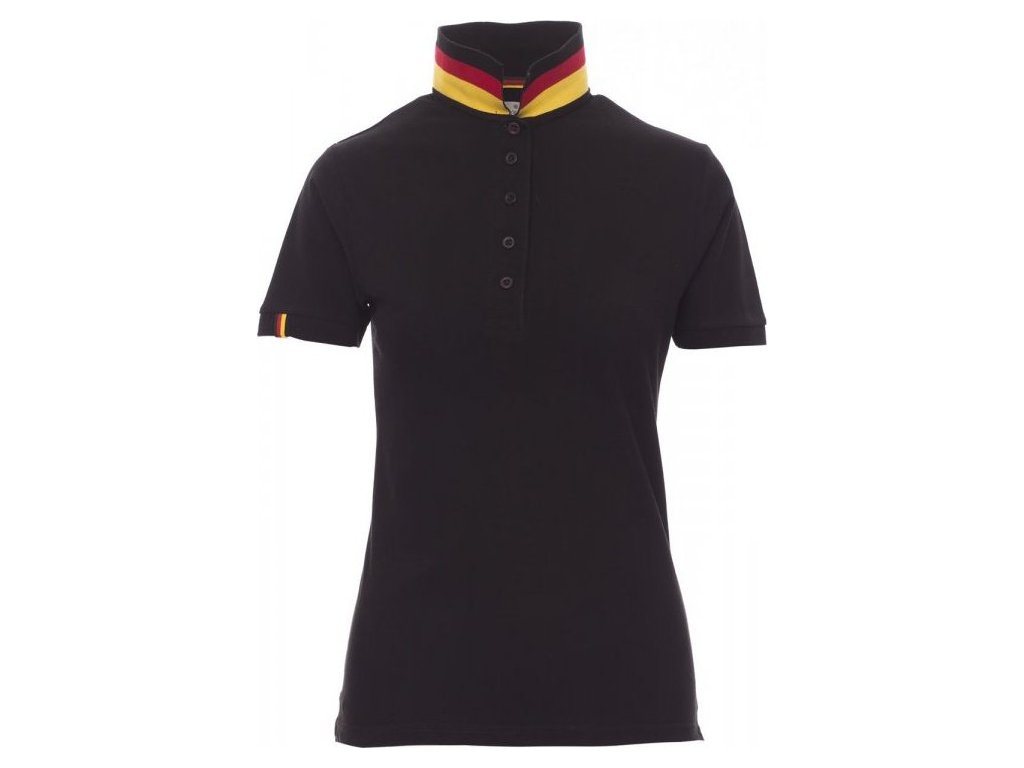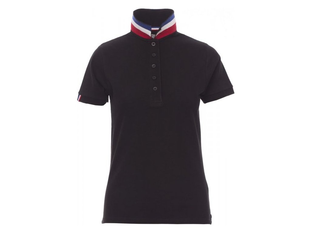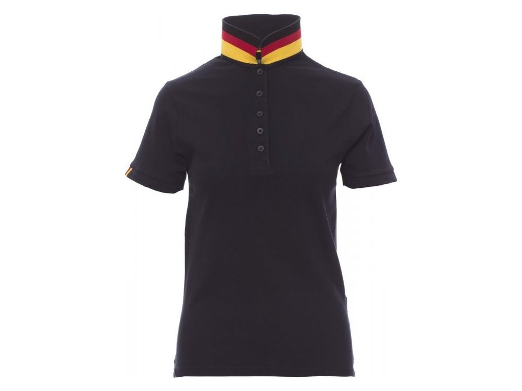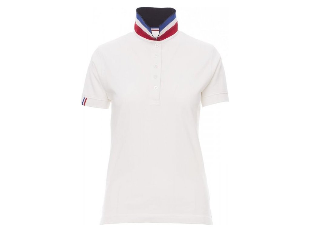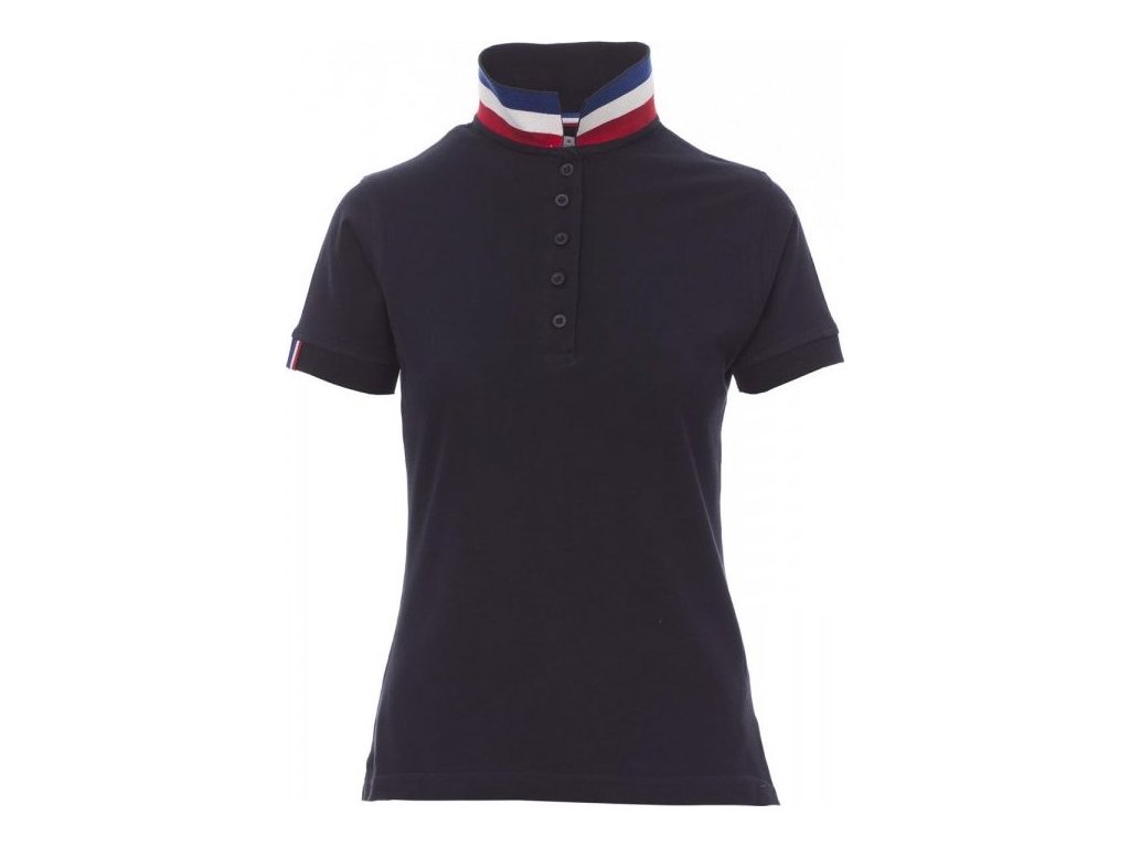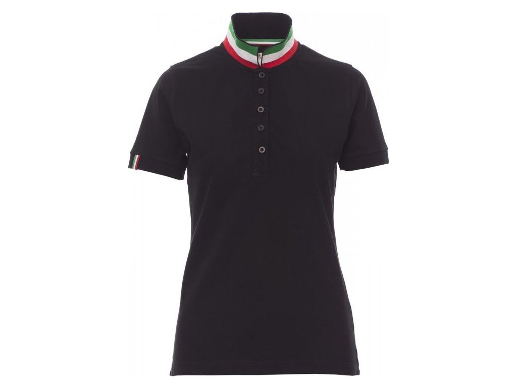 POLOKOŠILE_MANICA CORTA_Dámská vyštíhlená polokošile s krátkým rukávem s 5 barevně sladěnými perleťovými knoflíky, barevně sladěný límeček s kontrastním rubem v barvách italské vlajky, který je vidět pouze při zvednutí, barevně lemovaný pravý rukáv ve stejné barvě jako límeček, žebrovaný límeček a lemy rukávů, postranní rozparky v barvách italské vlajky, skryté prošití límečku s žerzejovým úpletem rovněž v barvách vlajky, postranní vyztužovací páska, tvarovaná výztuž na spodní straně límečku.