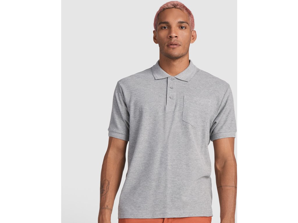 Pánská polokošile s krátkým rukávem a kapsou na levé straně na hrudi. Límec a ukončení rukávů z žebrované látky 1x1. Zapínání na 3 knoflíky.