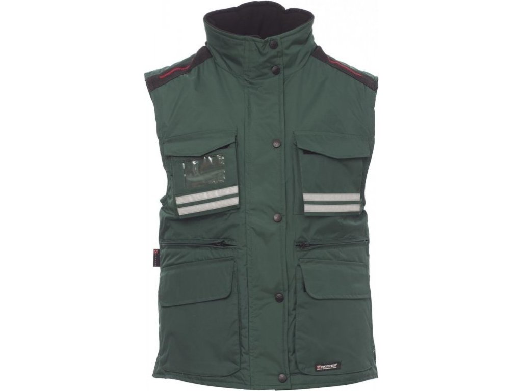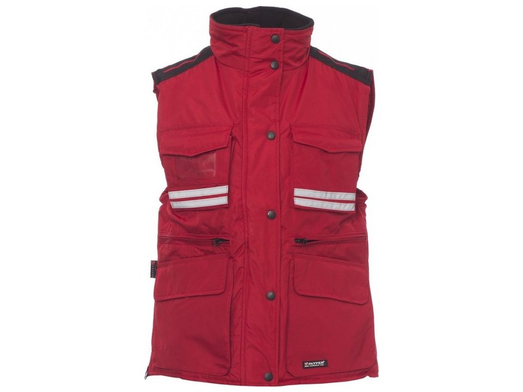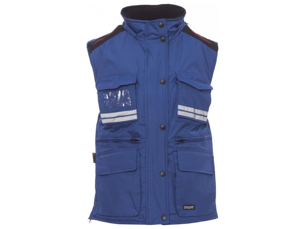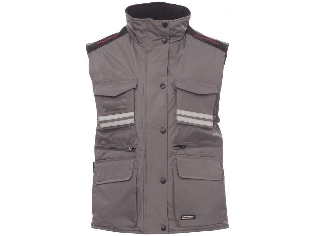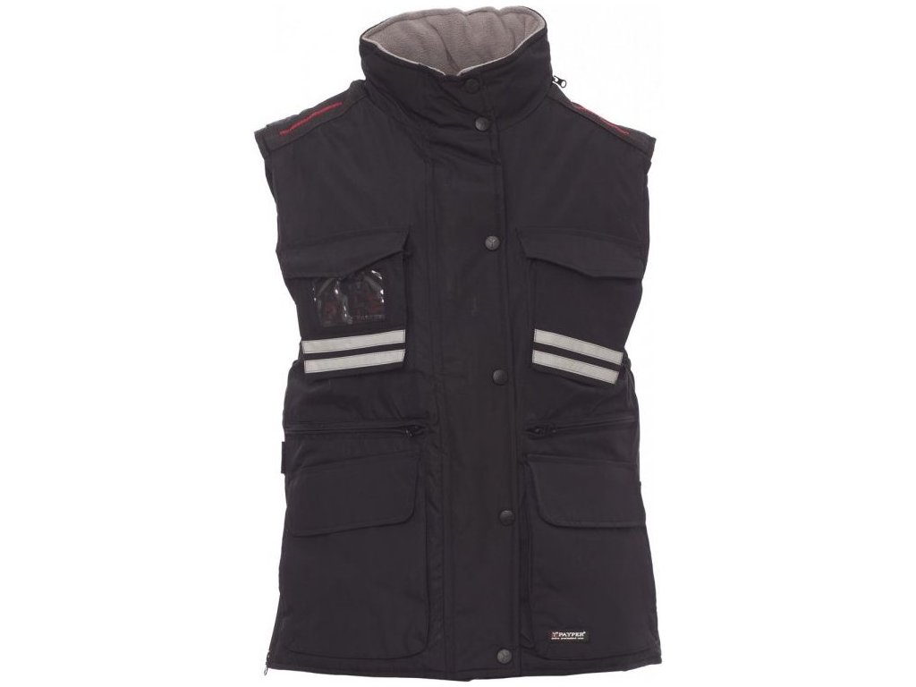 VESTY_IMBOTTITO SENZA MANICHE_Ergonomická dámská vesta s 8mm plastovým zipem s kovovým jezdcem zakrytým klopou s plastovými knoflíky, odepínatelná tvarovaná kapuce v límci, šedé reflexní pruhy na přední a zadní straně, boční rozparky s klínkem a zipem, devět vnějších kapes, dvě s LOCK SYSTEMem, dvě na zip a s vnitřní výztuží, jedna s oboustranným pouzdrem na jmenovku. Vnitřek: zateplený, mikroflísový límec, více zateplená záda a spodní část, stahovací šňůrka v pase a zip na vnitřní straně pro snadnější potisk a vyšívání.