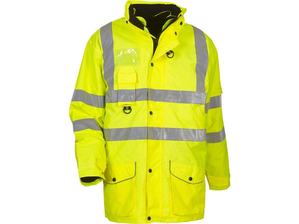 Voděodolné, prodyšný materiál, odnímatelná kapuce, náprsní kapsa, podlepené švy, zip uvnitř k připevnění vnitřní bundy, certifikováno podle EN ISO 20471:2013 třída 3, garantované reflexní vlastnosti podle EN - normy pro 25 praní, pratelné na 40°, vnitřní bunda: odnímatelné rukávy, 2 vnější a vnitřní kapsy, lze nosit oboustranně, certifikováno podle EN ISO 20471 třída 2