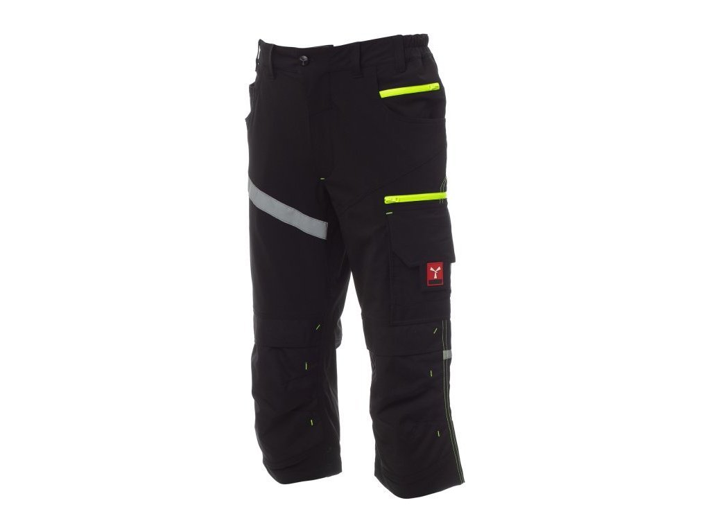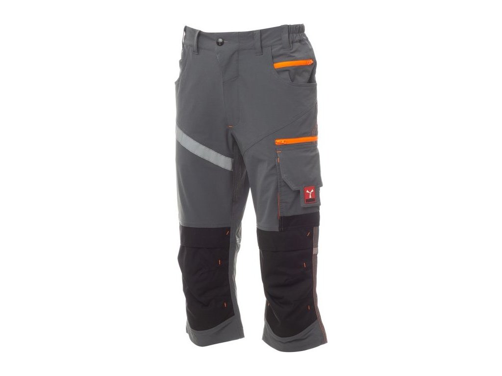 KALHOTY_CARGO_Unisexové pirátské kalhoty (3/4), tkanina „4 way stretch“, gumičky na bocích a poutka na pásek v pase, zapínání na zip a přizpůsobený knoflík. Na přední straně kalhoty mají dvě zakulacené kapsy, na pravé straně kapsičku na mince a na levé straně bezpečnostní kapsičku na zip. Na přední straně levé nohavice jsou tři kapsy: vodorovná kapsa se zapínáním na zip, kapsa s tvarovanou klopou na suchý zip a pouzdrem na jmenovku, malá svislá kapsa se zapínáním na zip. Na přední straně pravé nohavice je reflexní páska. Obě nohavice mají připevnění pro chrániče kolen z Nylon Oxford 500D s rozepínáním seshora. Na zadní straně je kapsa s klopou na suchý zip, očko na kladivo, otevřená kapsa na svinovací metr a kapsička na smartphone s klopou na suchý zip (pravá nohavice), otevřená kapsa se dvěma reflexními páskami (levá nohavice), reflexní vsadky ve výšce kolen pro obě nohavice. Boční prošívání a kontrastní výztuže na různých místech. Italské prostřední velikosti 48-50-52 mají vnitřní délku nohavic 51 cm.