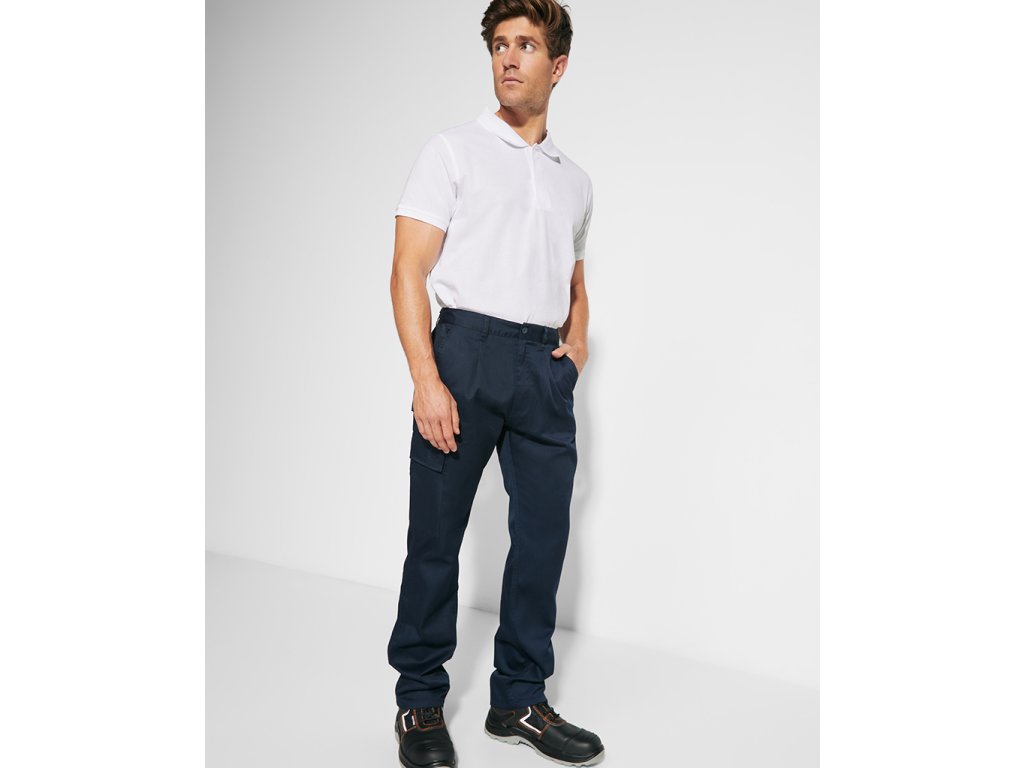 Pracovní kalhoty vyrobené z vysoce odolnél átky. Upravitelný obvod pasu pomocí elastické části na zadní straně. Dvě přední kapsy. Jedna zadní kapsa s klopou. Jedna boční vnější kapsa s klopou na pravé straně a bez příklopky na levé straně.