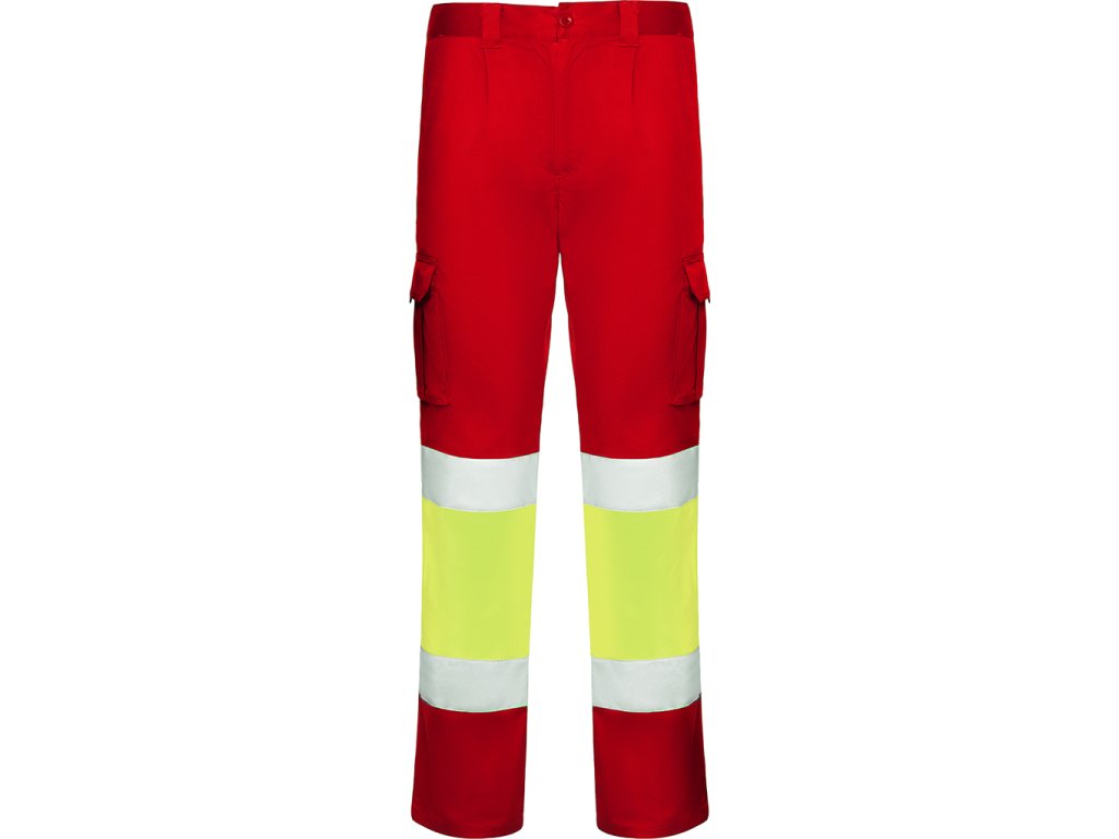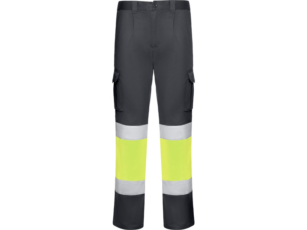 Pracovní dlouhé kalhoty s reflexními pruhy. Pohodlná a pružná tkanina. Nastavitelný elastický pas v zadní části. Kalhoty, které mají dvě přední kapsy, zadní a boční kapsy s klopou a zapínáním na suchý zip. Kombinace dvou barev s reflexními pruhy. Certifikace CE podle norem: EN ISO 13688:2013/A1:2021 a EN ISO 20471:2013/A1:2017. Třída I.