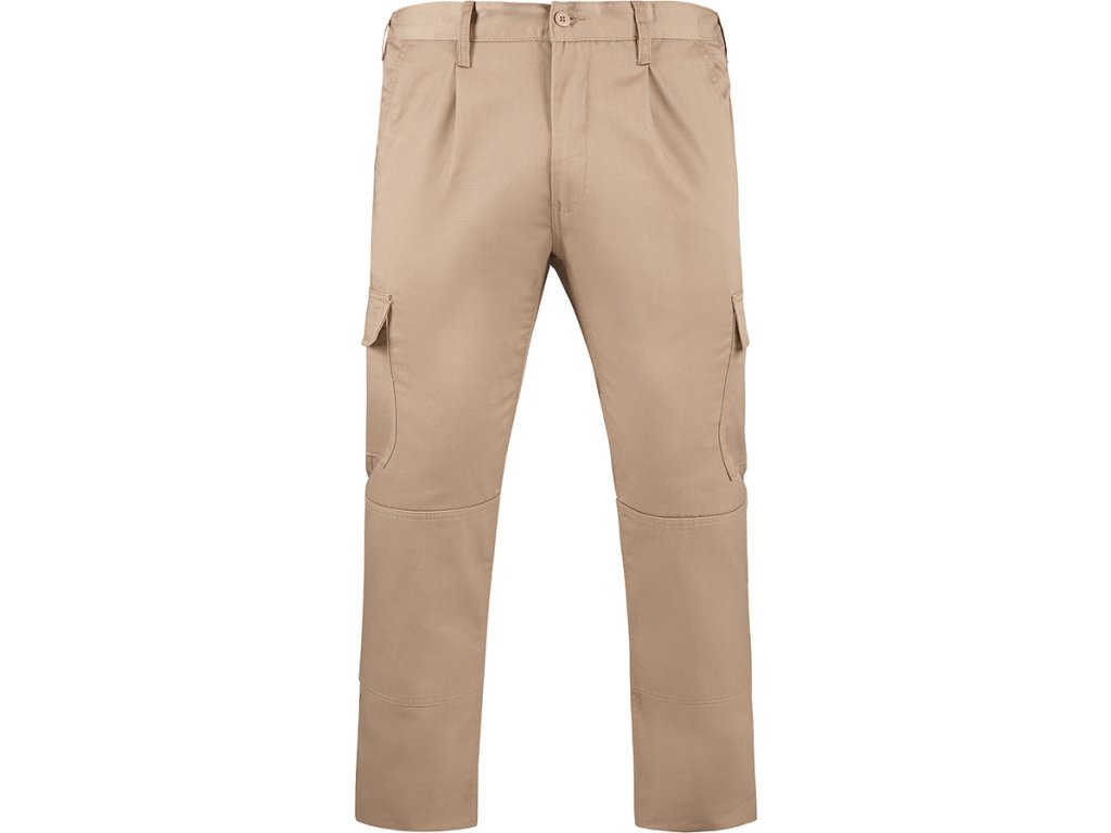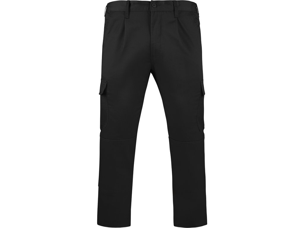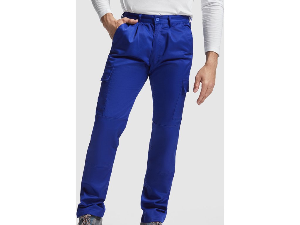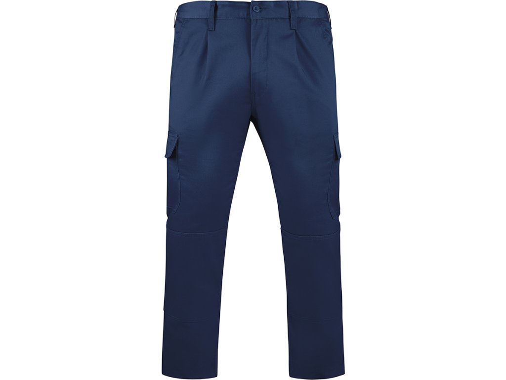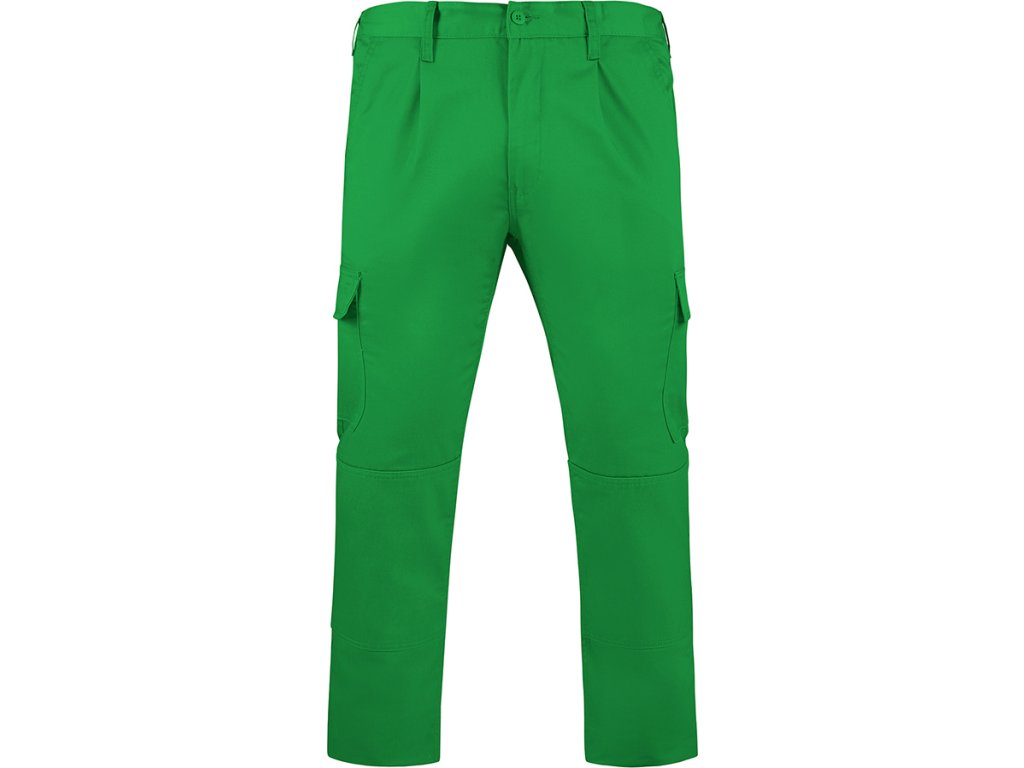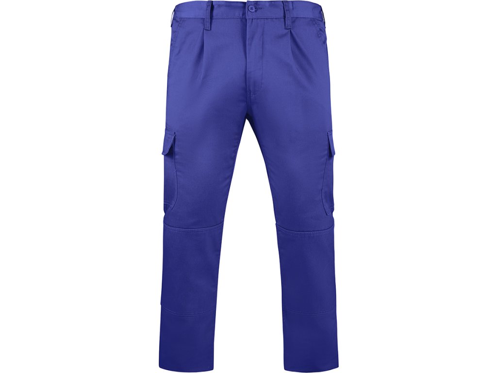 Pracovní kalhoty z vysoce odolné látky. Upravitelný obvod pasu pomocí elastické části na zadní straně. Jedna postranní a dvě zadní funkční kapsy kryté klopou se zapínáním na suchý zip. Pas s poutky na opasek.