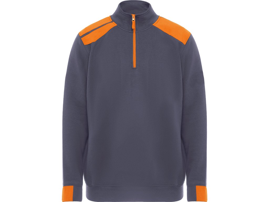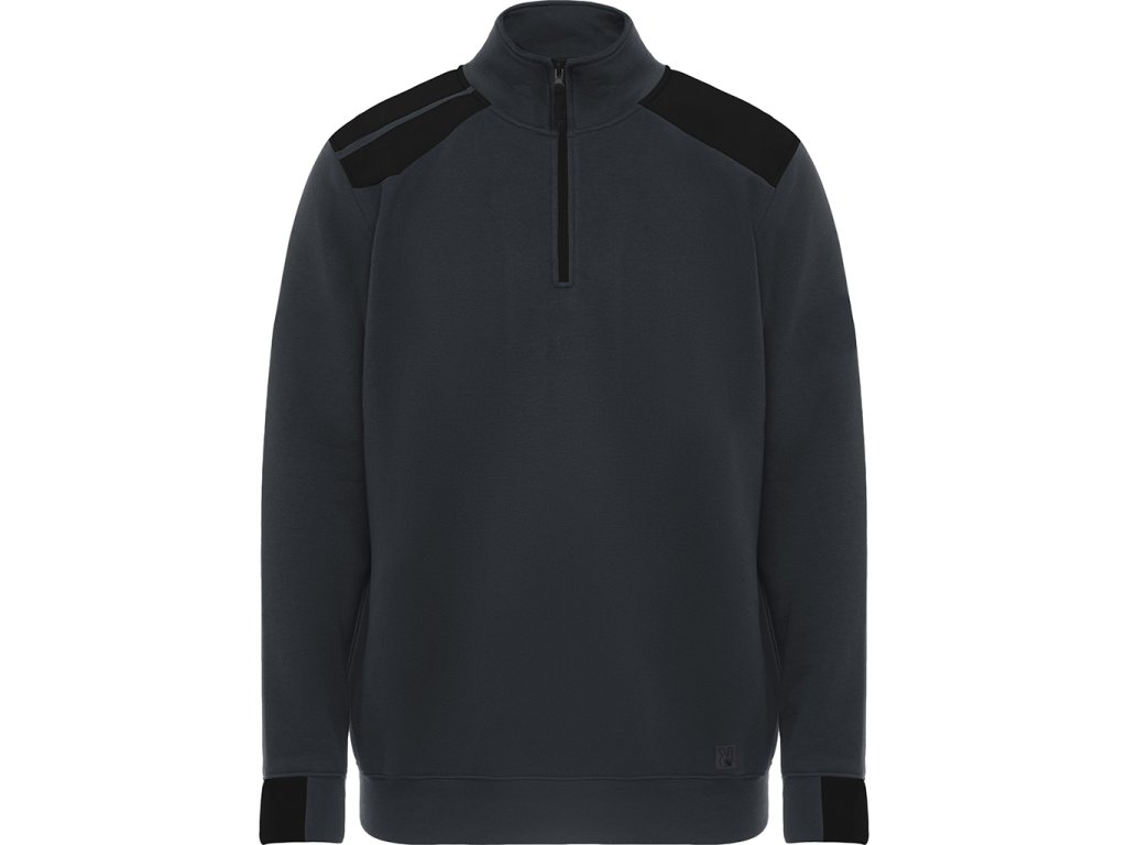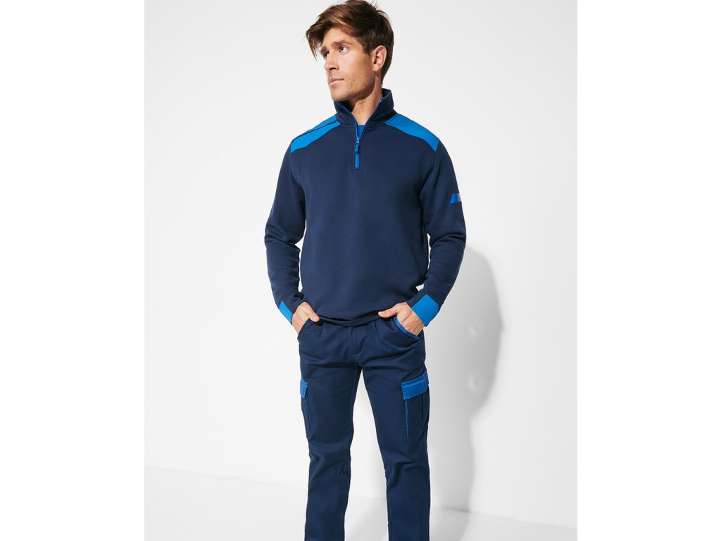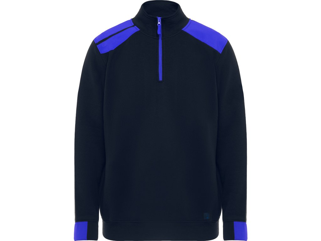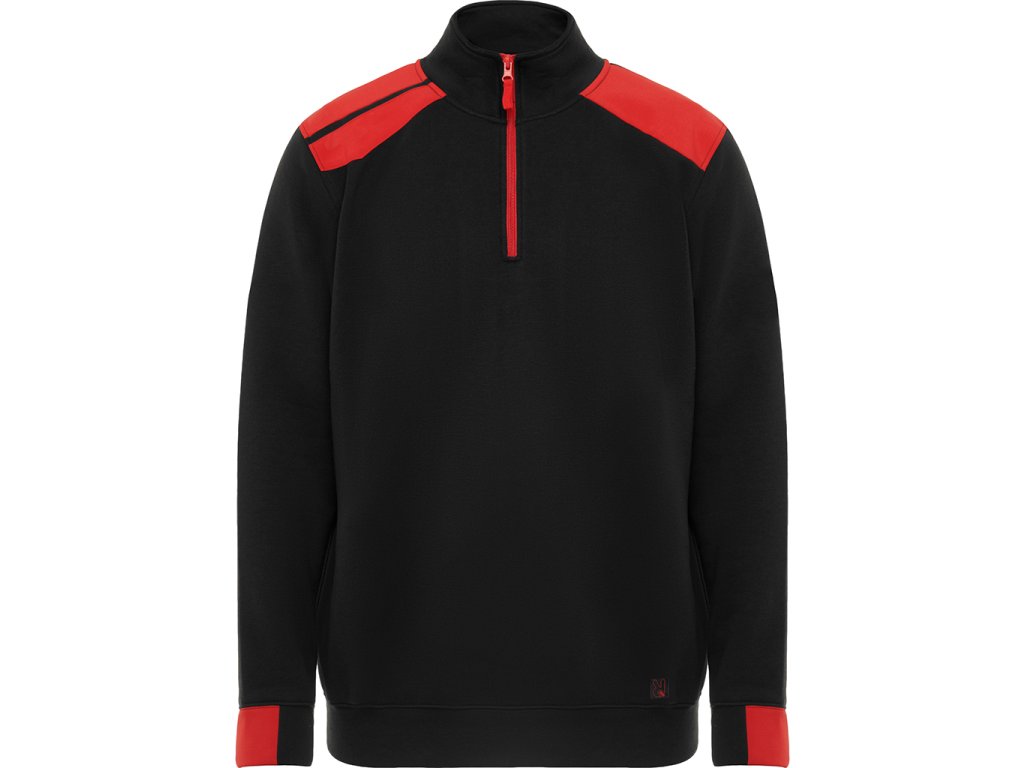 Pánská mikina s polovičním zipem, kombinací barev a vysokým límcem. Mikina má polovinu manžety a spodní lem ze žebrované látky 1x1, také má zasílené a kryté prošité na vnitřním límci. Rameny a detaily má v kontrastní barvě.