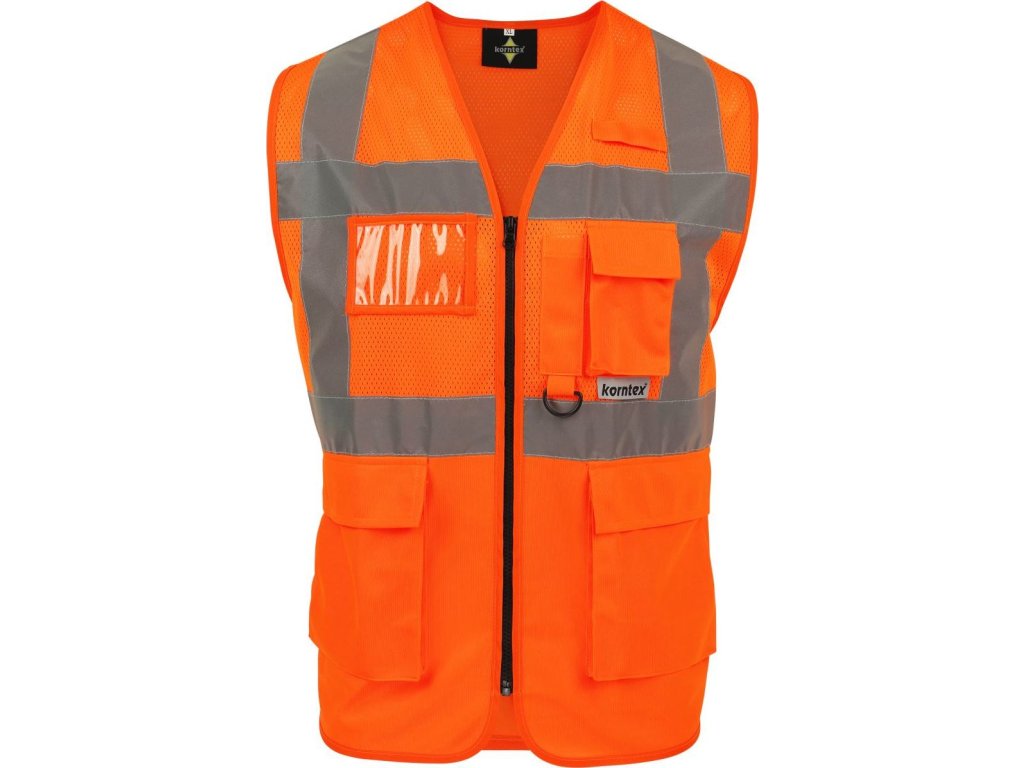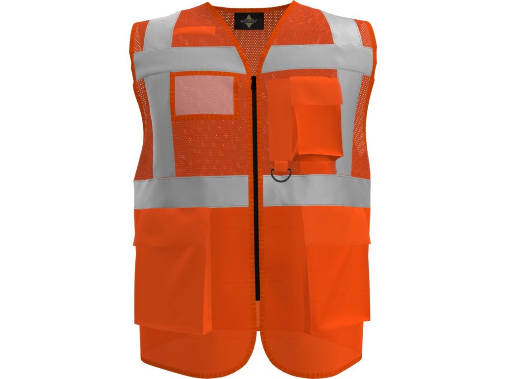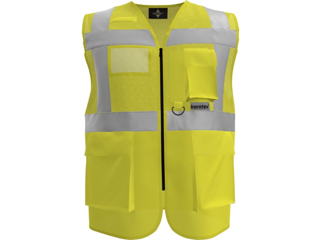 2 kapsy s klopami na suchý zip, 1 kapsa na mobilní telefon, prodyšné síťované vsadky, kroužek k připevnění karty, klíčů, atd., certifikováno podle EN ISO 20471 2013 a A1 2016, 1 reflexní pruh přes každé rameno, reflexní pruhy každý 5cm široký kolem hrudníku a těla, dobře viditelný materiál pod reflexními pruhy
