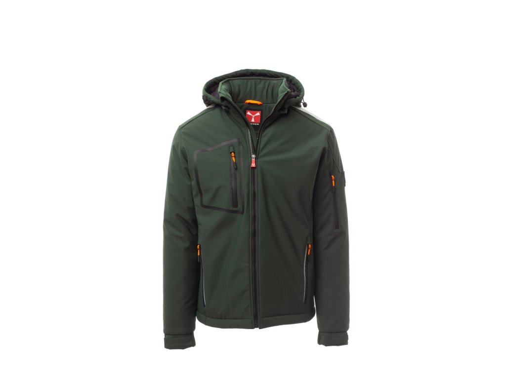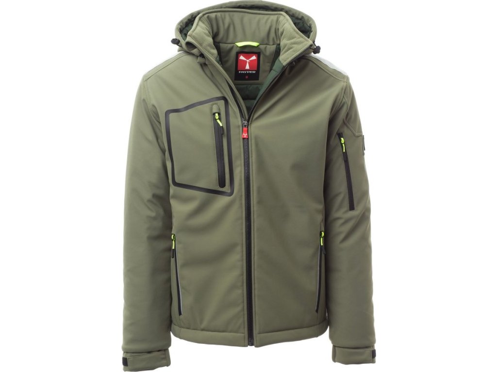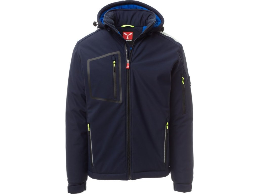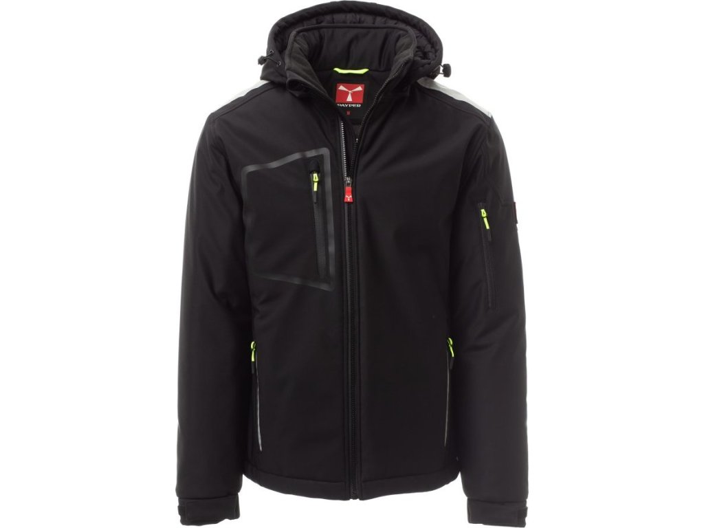 ZATEPLENÉ SOFTSHELLY_ZATEPLENÁ BUNDA S KAPUCÍ_WP 8000 mm H₂O, WVT 5000 g/m² 24h. Pánský zateplený softshell, zapínání na zip SBS s kovovým jezdcem „semi-auto lock“ a přizpůsobeným taháčkem. Odnímatelná kapuce se stahovací šňůrkou. Vnitřní límec s flísovými bočními prvky. Reflexní pruhy na ramenou, zádech a zadní straně kapuce. Elastické stahovací manžety na suchý zip a vnitřní návlek. Tepelně zatavená kapsa na hrudi s voděodolným zipem. Dvě boční kapsy na zip s reflexním prvkem. Jedna kapsa na levé paži s integrovaným očkem na pero na zip. Fluorescenční taháčky. Dvě vnitřní kapsy, jedna pravá tvarovaná na hrudi na zip a druhá na tablet na suchý zip. Spodní část stažitelná pomocí přizpůsobených zarážek.