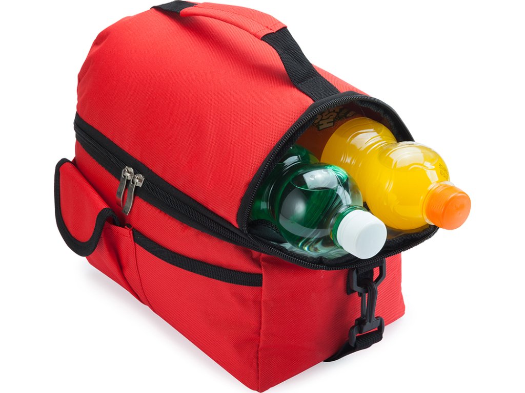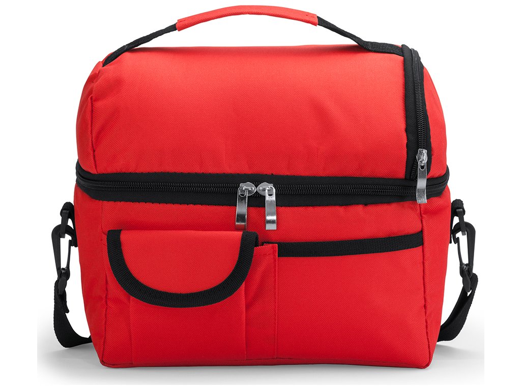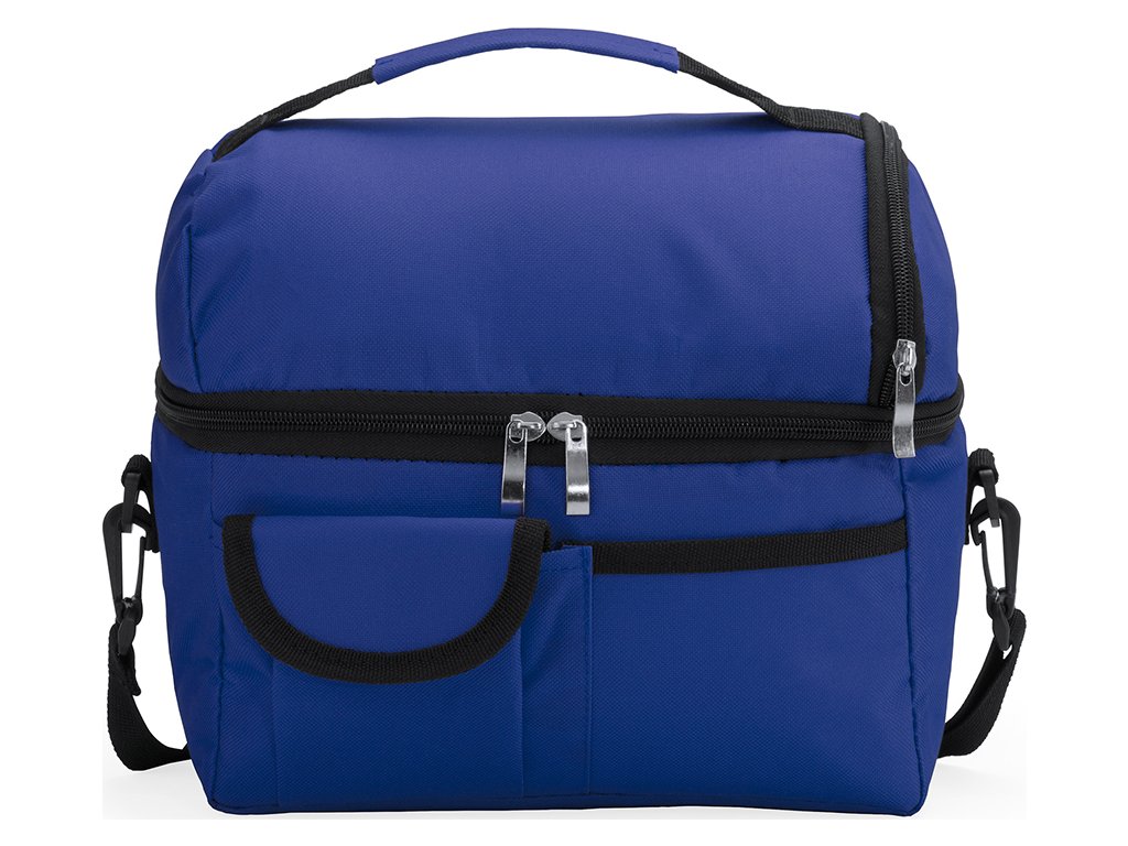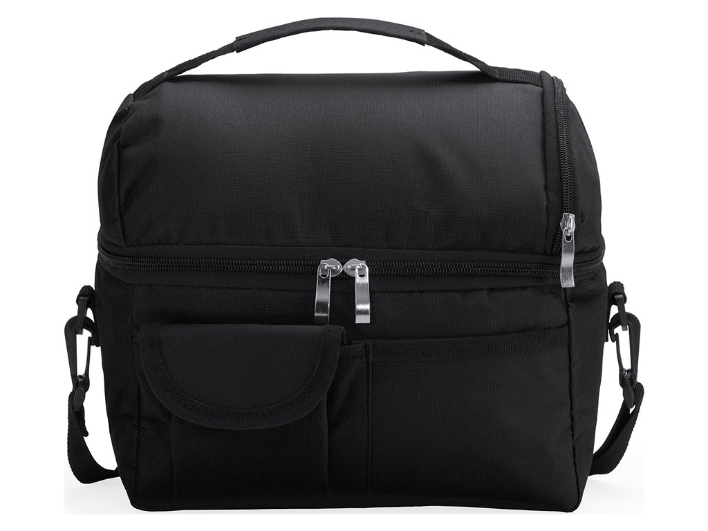 Víceúčelová chladicí taška z polyesteru 600D. Izotermické vnitřní přihrádky a praktické vnější kapsy. Nastavitelný a polstrovaný ramenní popruh s karabinou.