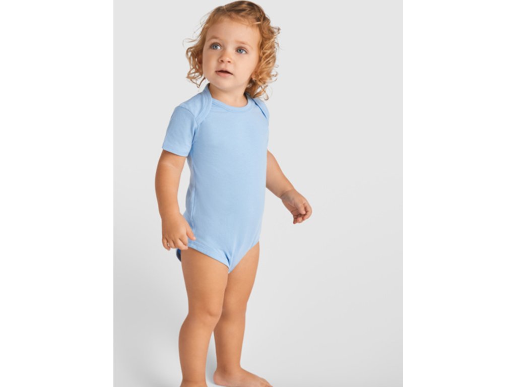 Kojenecké body s krátkým rukávem. 1x1 žebrovaný průkrčník a spodní část. Zapínaní na cvočky v rozkroku. Na ramínkách překřížení pro snadné oblékání.