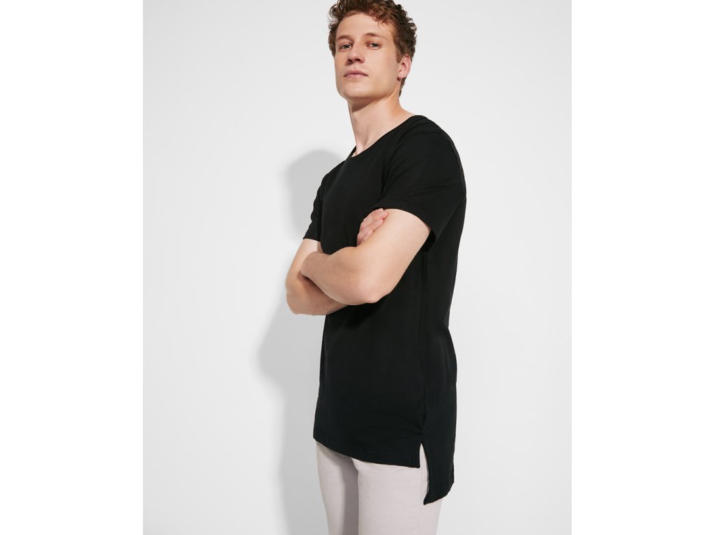 Dlouhé unisex triko s krátkým rukávem. Dvouvrstvý průkrčník s elastanem. Boční rozparky. Prodloužený zadní díl.