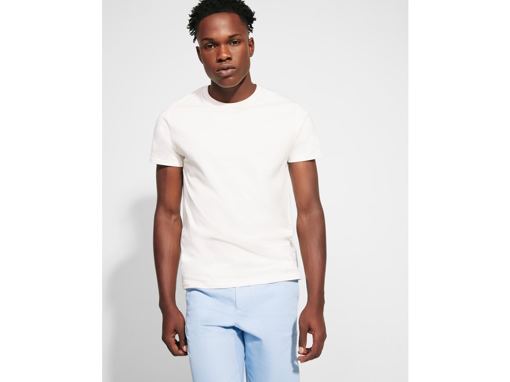 Pánské tričko s krátkým rukávem z organické bavlny, bez bočních švů. Kulatý průkrčník s žebrováním 1x1. Dekorativní prošití na spodním lemu a rukávech. Barva 58 (melange) - složení 85% bavlna/15% polyester