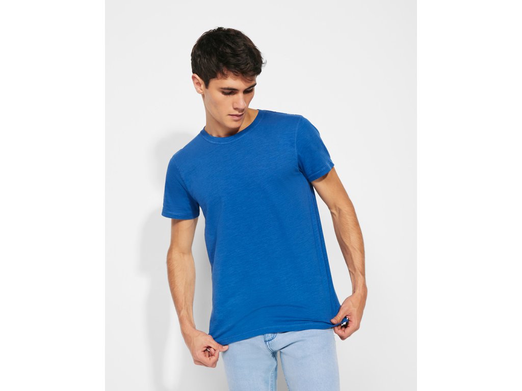 Tričko s krátkým rukávem, melange vzor. Kulatý výstřih ze stejné látky. Boční švy. Spodní lem s postranními rozparky a střih zadního dílu je trochu delší než přední. Odnímatelný štítek.