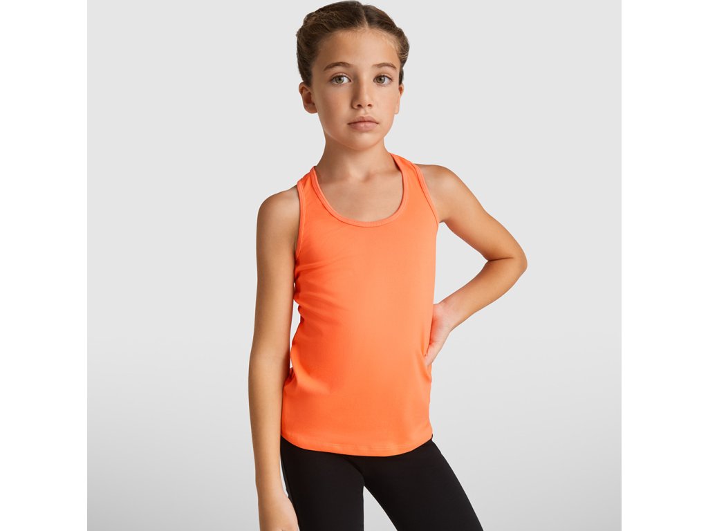 Sportovní dámské/dívčí tílko s kulatým výstřihem a se zadním vykrojením v plaveckém stylu. Vyrobeno z polyesteru, na omak materiál působí jako bavlna. Přiléhavý střih.