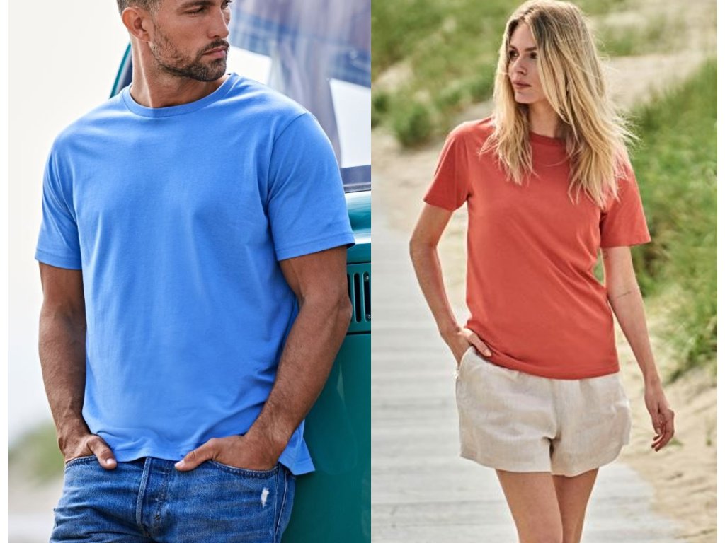 185g/m², 100% dvakrát předsražená, česaná prstencová certifikovaná organická bavlna, silikonové praní, enzymaticky prané, single jersey, heather: 85% bavlna, 15% viskóza
