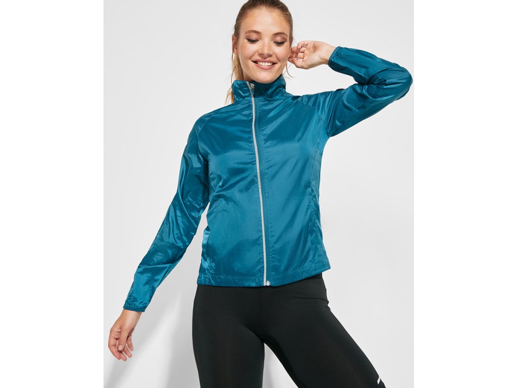 Dámská větrová bunda z lehké funkční látky bez podšívky. Vnitřní strana límce s podšívkou z prodyšné látky a prošitými švy. Obrácený zip s reflexním detailem, ochranou pro bradu a poutkem. Raglánový střih rukávů. Prodyšná látka v podpaží. Přední kapsy na zip. Přiléhavý střih. Vnitřní kapsa na uschování oděvu. Manžety s elastickou obrubou. Reflexní detaily na zadním díle. Trochu delší zadní díl. Odnímatelný štítek. Větrovka je odolná proti větru, nepromokavá a prodyšná. Látka má kostkovanou texturu. Duo koncept.
